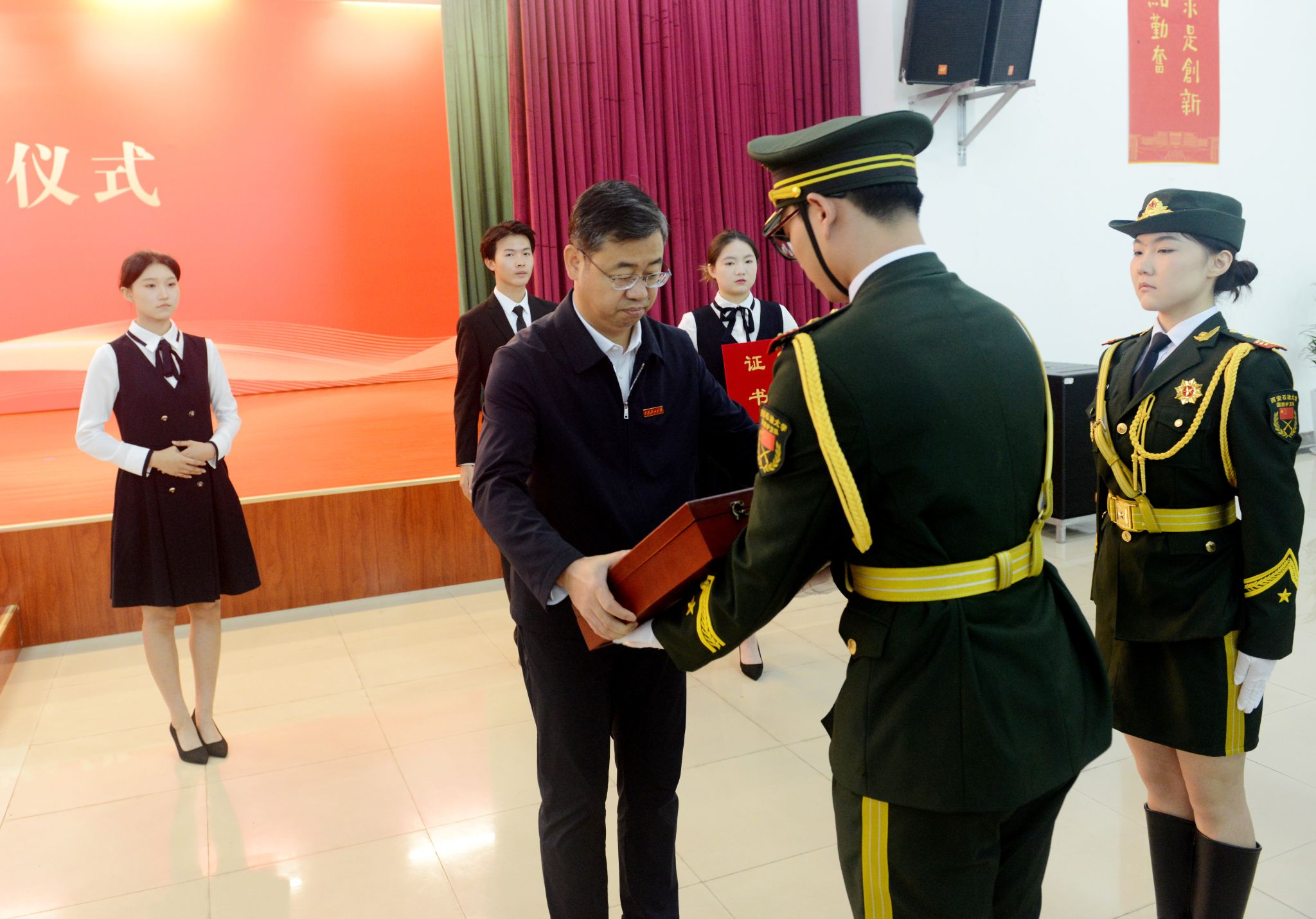 上午8时,仪式在庄严的氛围中正式开始。校长王进富将获赠的国旗及证书郑重交予学校国旗护卫队,国旗护卫队队员神情肃穆,步伐铿锵,庄严地护送国旗入场。这面国旗旗长5米、宽3.3米,为超大国旗,整幅旗面无拼接,五颗星由织造人员手工缝制,工艺特殊,承载着亿万中华儿女的深厚爱国情怀,也凝聚着我校建校70周年的特别纪念。