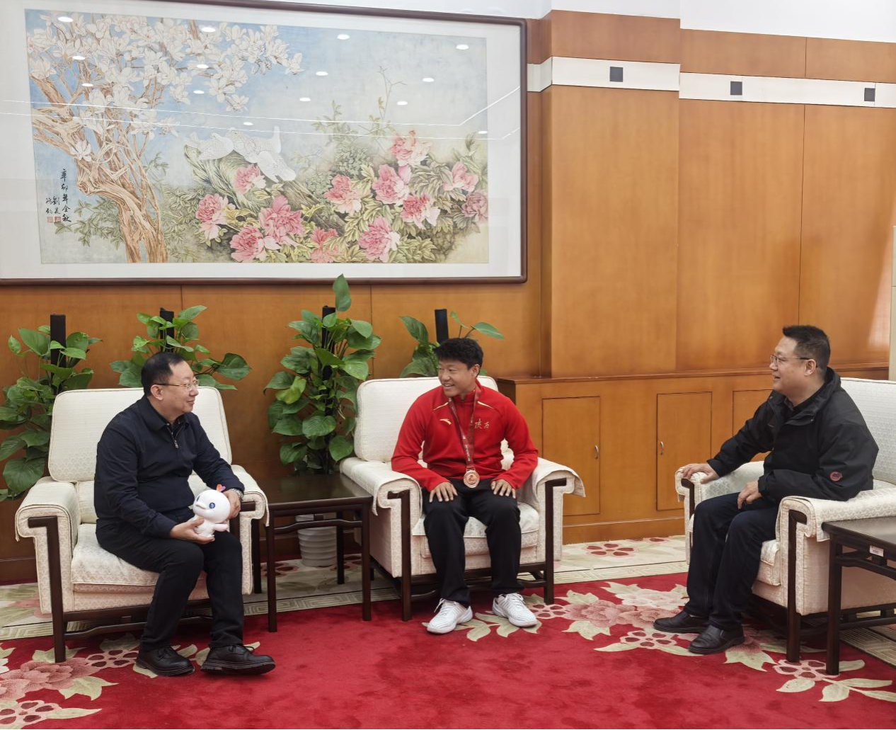 慰问现场,种宇宏与吴荣平亲切握手交谈,详细询问了他的训练生活、赛场表现及赛后恢复情况,充分肯定了他在赛事中展现的顽强拼搏、奋勇争先的体育精神和艰苦奋斗、攻坚克难的铁人精神。种宇宏副校长表示,吴荣平作为西安石油大学培养的教师运动员,在赛场上不畏强手、勇攀高峰的表现,生动诠释了“更快、更高、更强——更团结”的奥林匹克精神,也彰显了学校体育教育的丰硕成果。种宇宏指出,体育是学校人才培养的重要组成部分。学校将进一步做好运动员的训练保障和生活服务,为运动员创造更优越的成长环境。他希望体育学院教师们继续深耕教学训练,因材施教、科学指导,助力运动员突破自我。同时,种宇宏鼓励全体运动员以此次获奖为新起点,兼顾好学业与训练,保持昂扬斗志,在未来的赛事中再创佳绩,为学校争光添彩,并带动更多同学参与体育锻炼,营造积极向上的校园体育文化氛围。