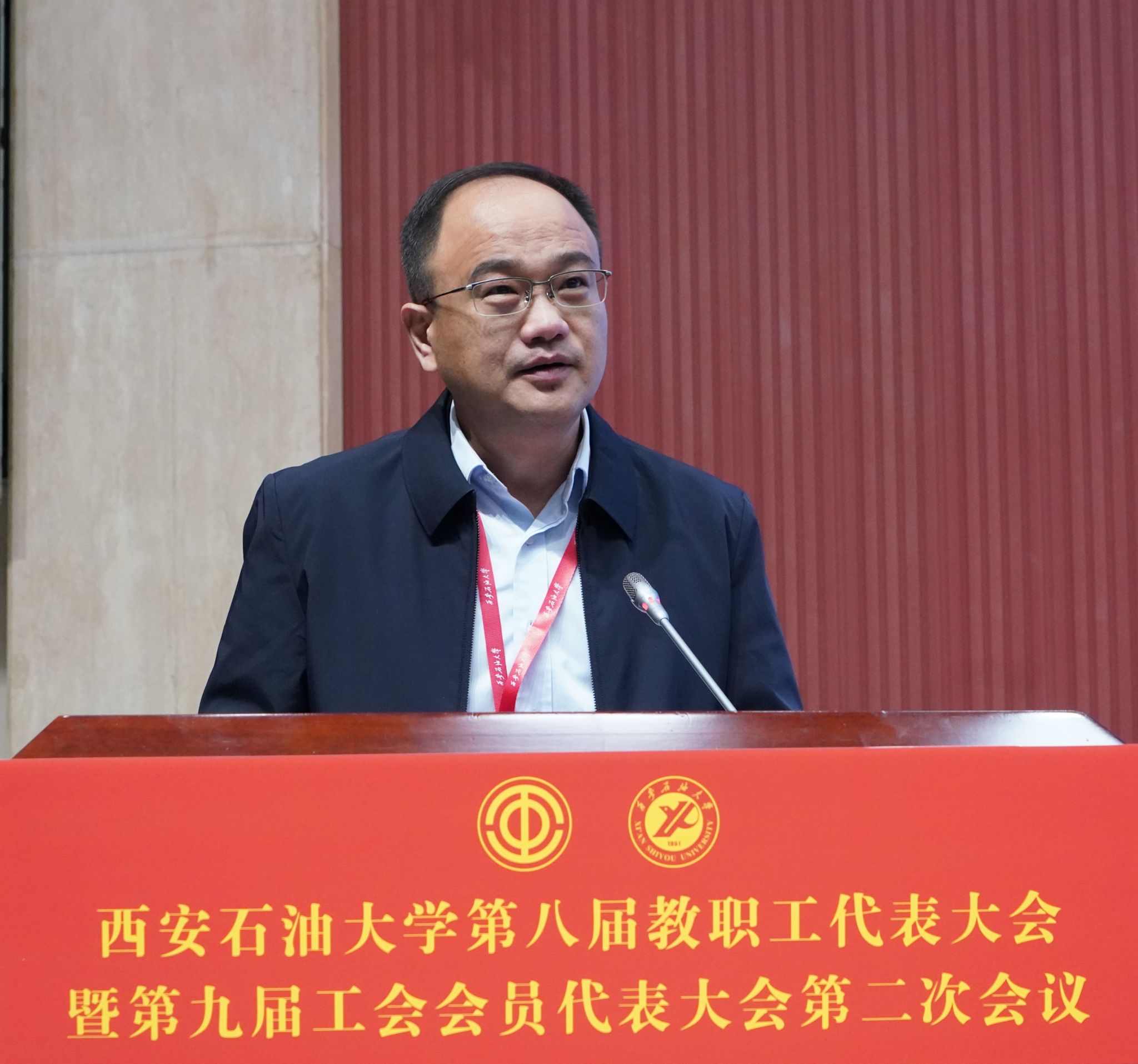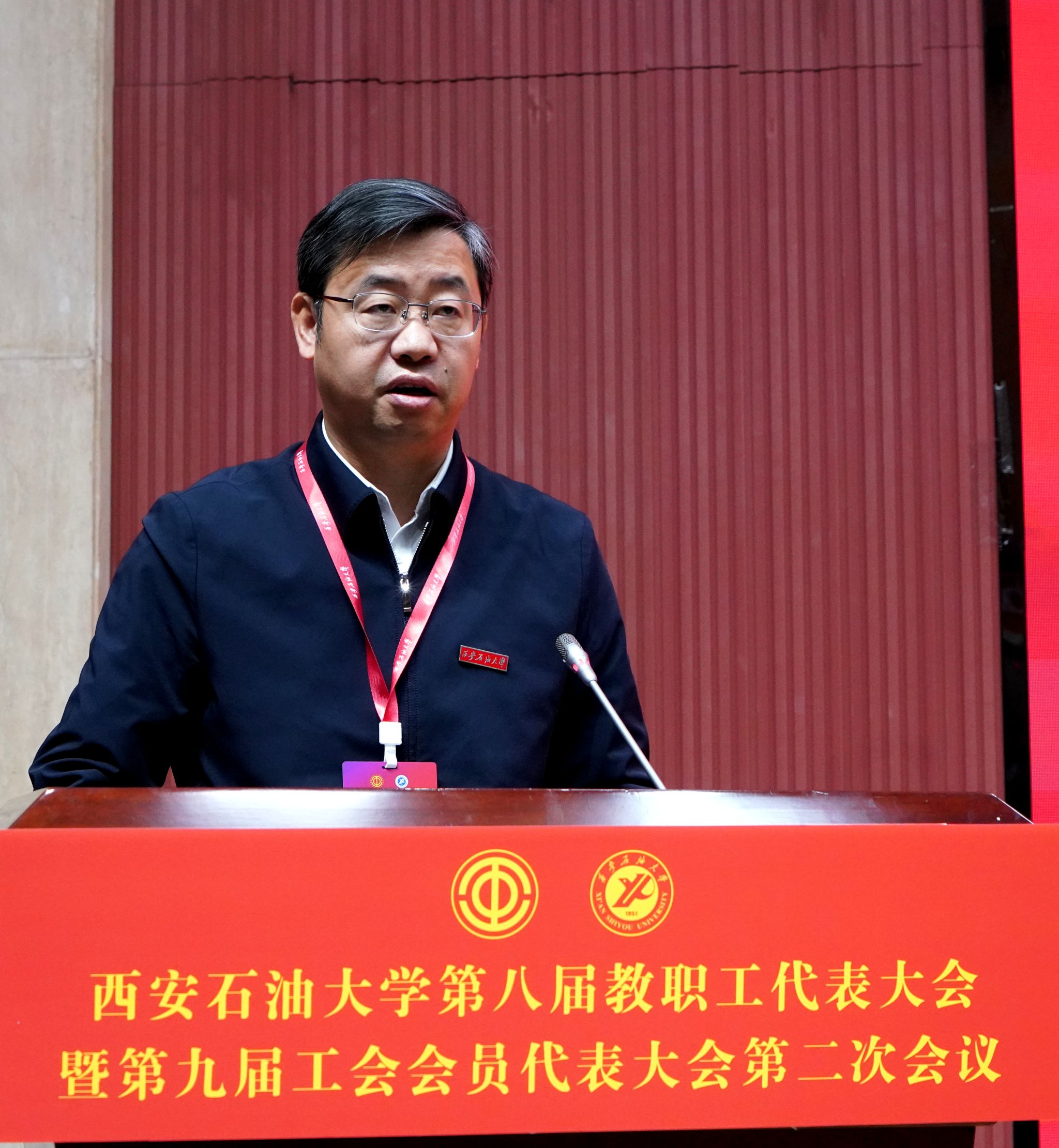 校长王进富作了《与岁功同辉以启程,携新程共远而擘画——年度报告暨“十五五”规划思考》的工作报告,他指出,本次教代会是在学校“十四五”冲刺收官的决胜之年,也是“十五五”谋篇布局的起势之年召开的一次重要会议,更是全面深化教育科技人才一体改革促进高质量发展的一次会议。报告从建设“三个西石大”的目标出发,全面回顾总结了2025年我校所取得的成就,并指出2025年全校上下紧扣 “学科达标年、人才提升年、改革创新年” 主线,扎实推进 “六大行动”,各项事业呈现出稳中有进、持续向好的发展态势。特别是2024年以来,全校争做行动派、跑出加速度,在学科突破、科创增长、人才汇聚等方面实现多项新突破,为 2026 年发展积累了宝贵经验、奠定了坚实基础。报告精准分析当前发展形势,对照教育强国建设要求、行业转型发展需要、师生校友殷切期盼,科学部署2026 年及今后一个时期的重点任务,为学校朝着特色鲜明的高水平教学研究型大学目标迈进凝聚起磅礴力量。