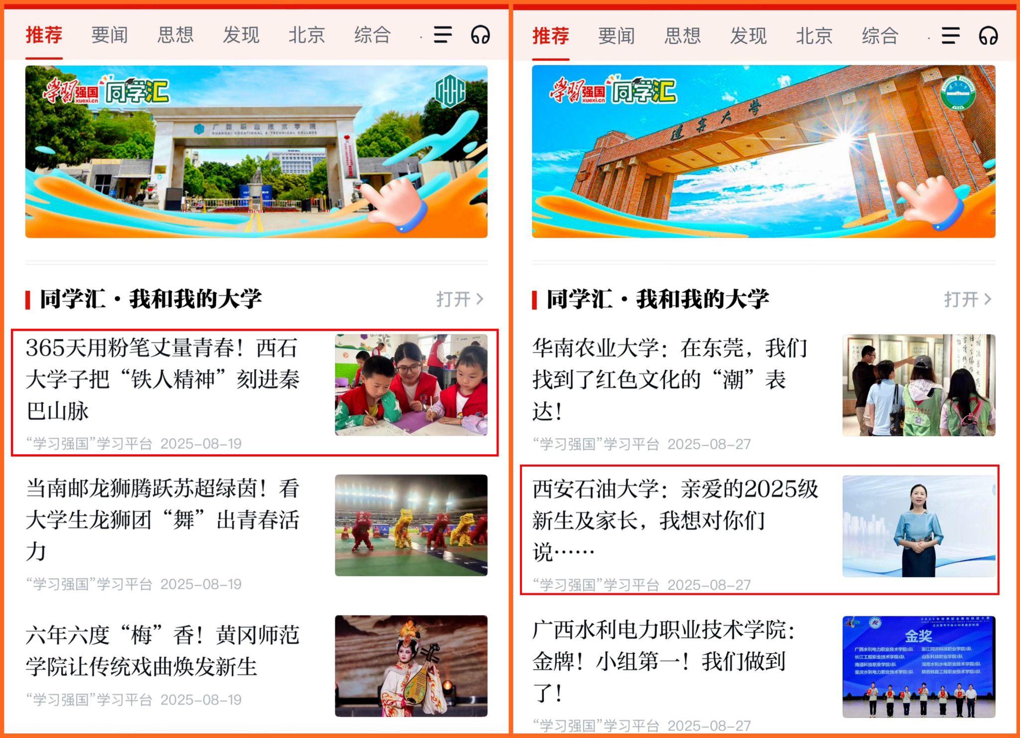 近日,中宣部宣传舆情研究中心、“学习强国”学习平台公布了2025年度同学汇获奖情况,我校继2024年度后再次获评“学习强国”同学汇“年度最具传播力高校”。我校作品《相遇,从一份录取通知书开始》获评“学习强国”同学汇“年度高校人气作品”。