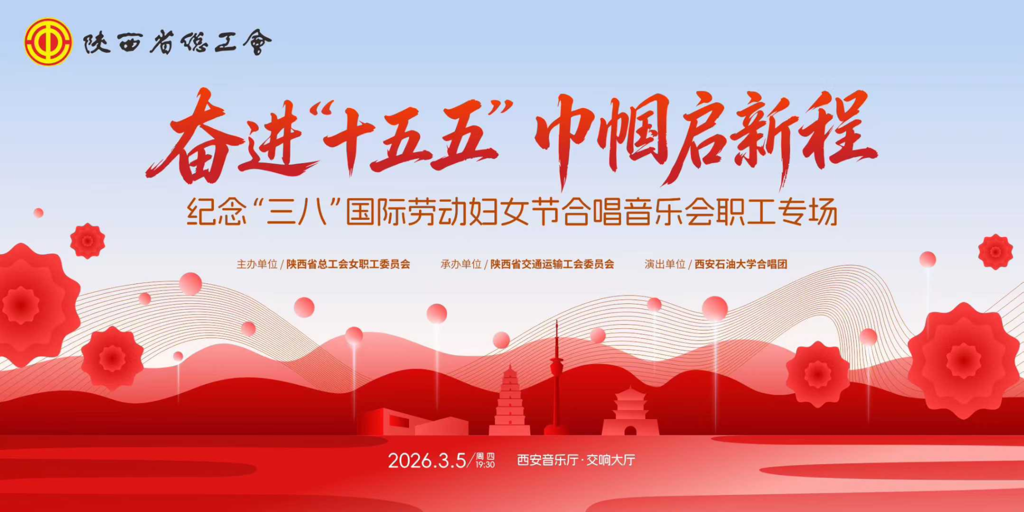 在“三八”国际劳动妇女节来临之际,3月5日,由陕西省总工会主办、陕西省交通运输厅工会委员会承办的“奋进十五五,巾帼启新程”纪念“三八”国际劳动妇女节合唱音乐会职工专场,在西安音乐厅交响大厅圆满呈现。我校合唱团受邀登台献艺,以一场融合陕北风情、石油情怀与巾帼赞歌的高水平合唱演出,向女性劳动者致以节日的美好祝福与崇高敬意。副校长赵健出席活动。