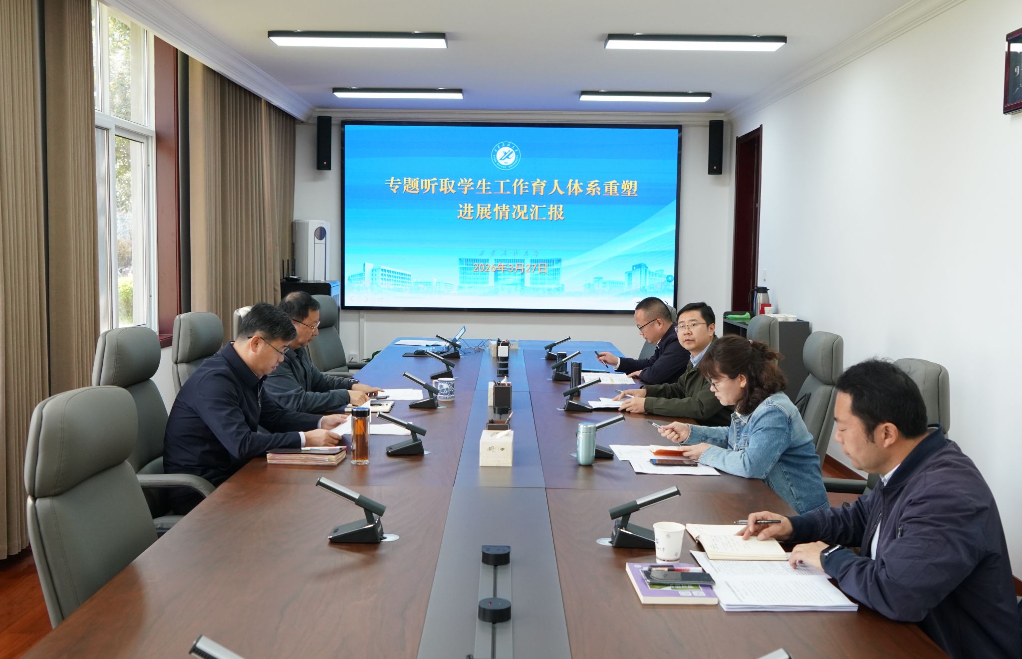 3月27日上午,我校学生工作育人体系重塑进展情况专题汇报会在鄠邑校区第五会议室召开。校长王进富出席会议并讲话,副校长种宇宏主持会议,学生工作部、研究生工作部、校团委相关负责人参加会议。