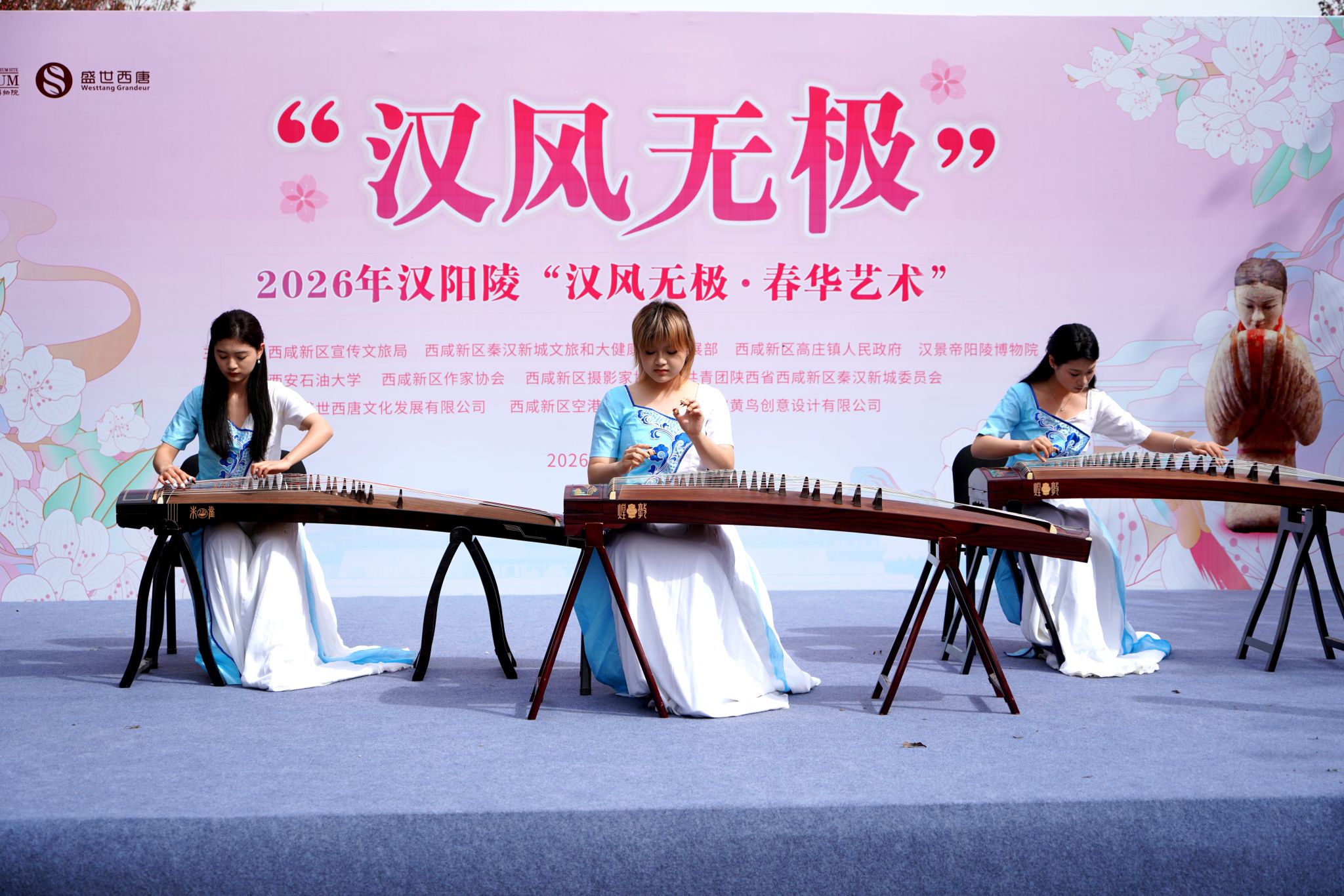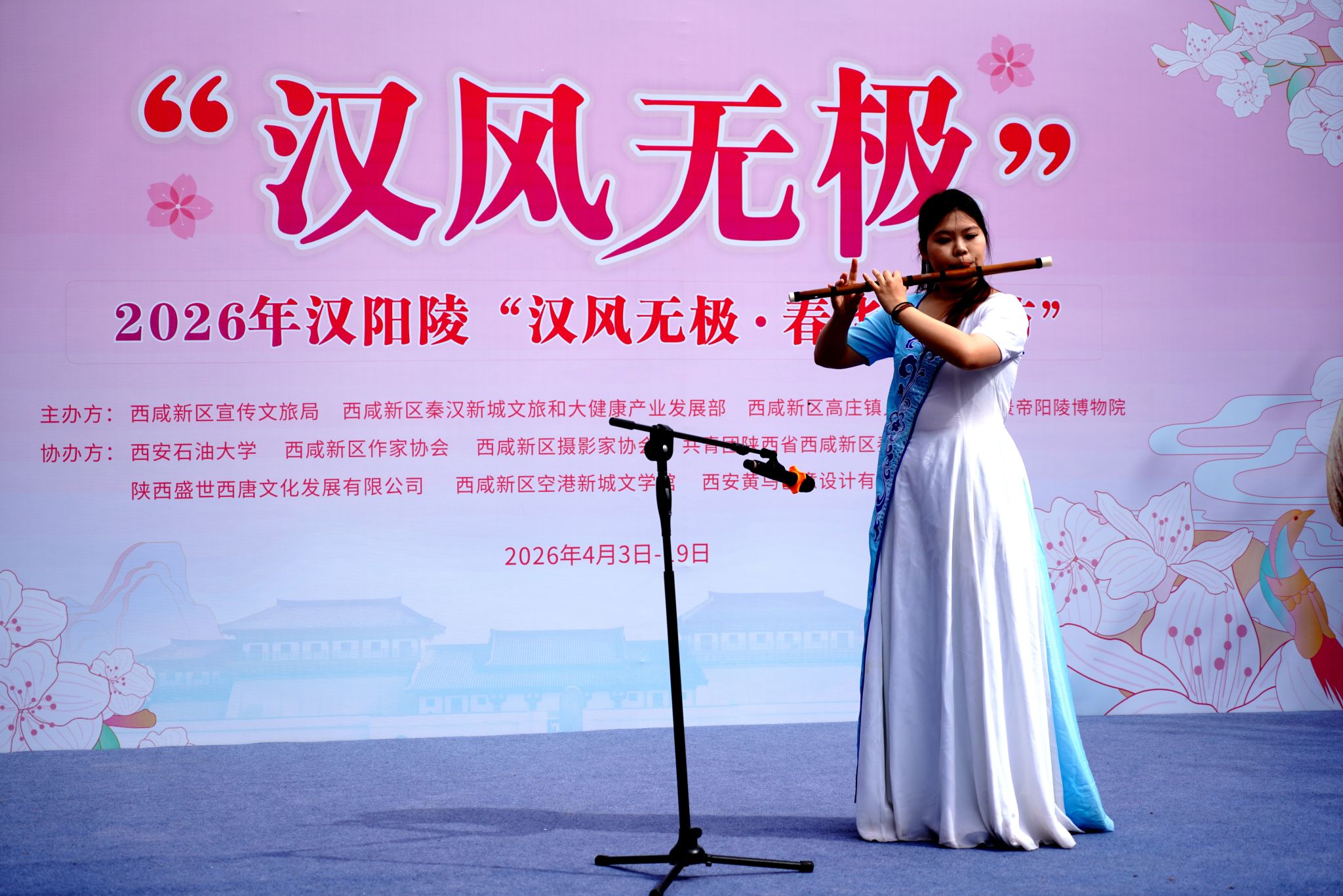 4月3日上午,2026年“汉风无极”春华艺术展演系列活动在汉景帝阳陵博物院樱花林正式开幕。我校作为协办单位,选派师生民乐团亮相开幕式文艺展演。校党委委员、党委宣传部部长赵承胜,党委宣传部、后勤处、音乐系相关负责人参加活动。