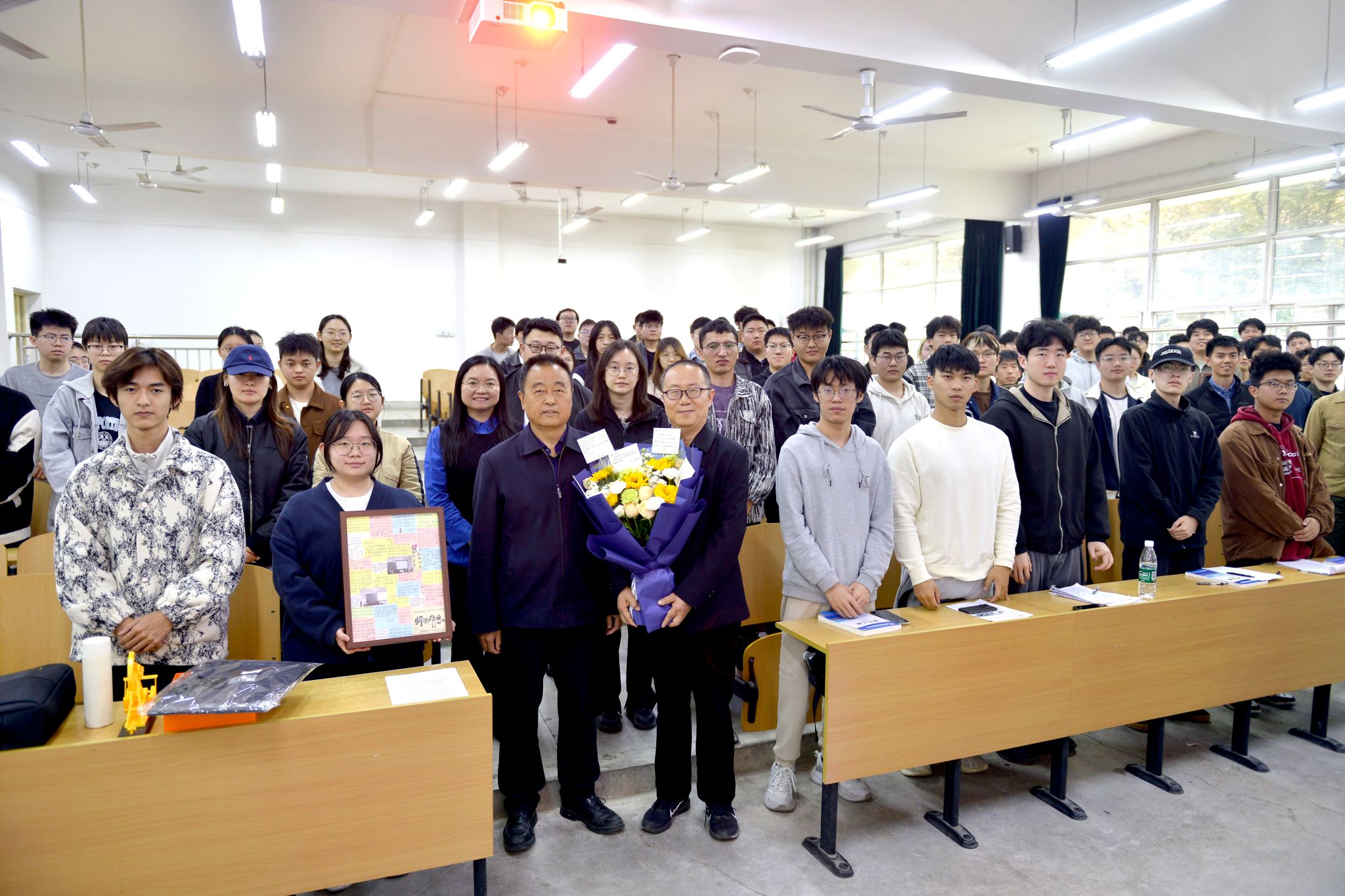 随后,程永清向王俊奇教授赠送了定制礼物:一杯一伞,寓意一辈子为学子撑伞护航。教师工作部部长、教师发展中心主任武晓朦向王教授赠送了由我校24级本科生创业企业设计制作的抽油机文创摆件。当学生代表为王老师送上由同学们亲手制作的祝福语纪念画框时,全体学生起立齐声:“王老师,您辛苦了,谢谢您!”