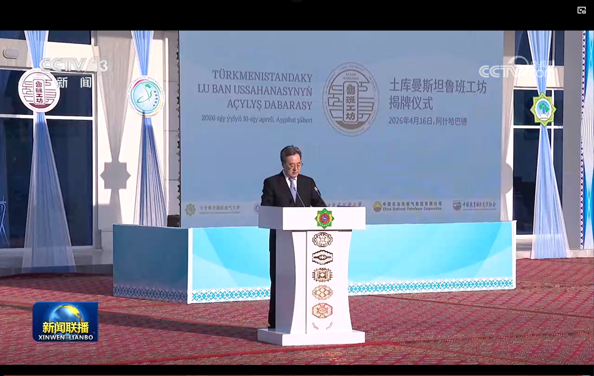 4月16日,土库曼斯坦鲁班工坊揭牌仪式在土库曼斯坦首都阿什哈巴德卡卡耶夫国际油气大学校内隆重举行。中共中央政治局常委、国务院副总理丁薛祥出席土库曼斯坦鲁班工坊揭牌仪式并致辞。土库曼斯坦副总理兼外长梅列多夫、副总理阿加扎诺夫、副总理马梅多夫出席活动。