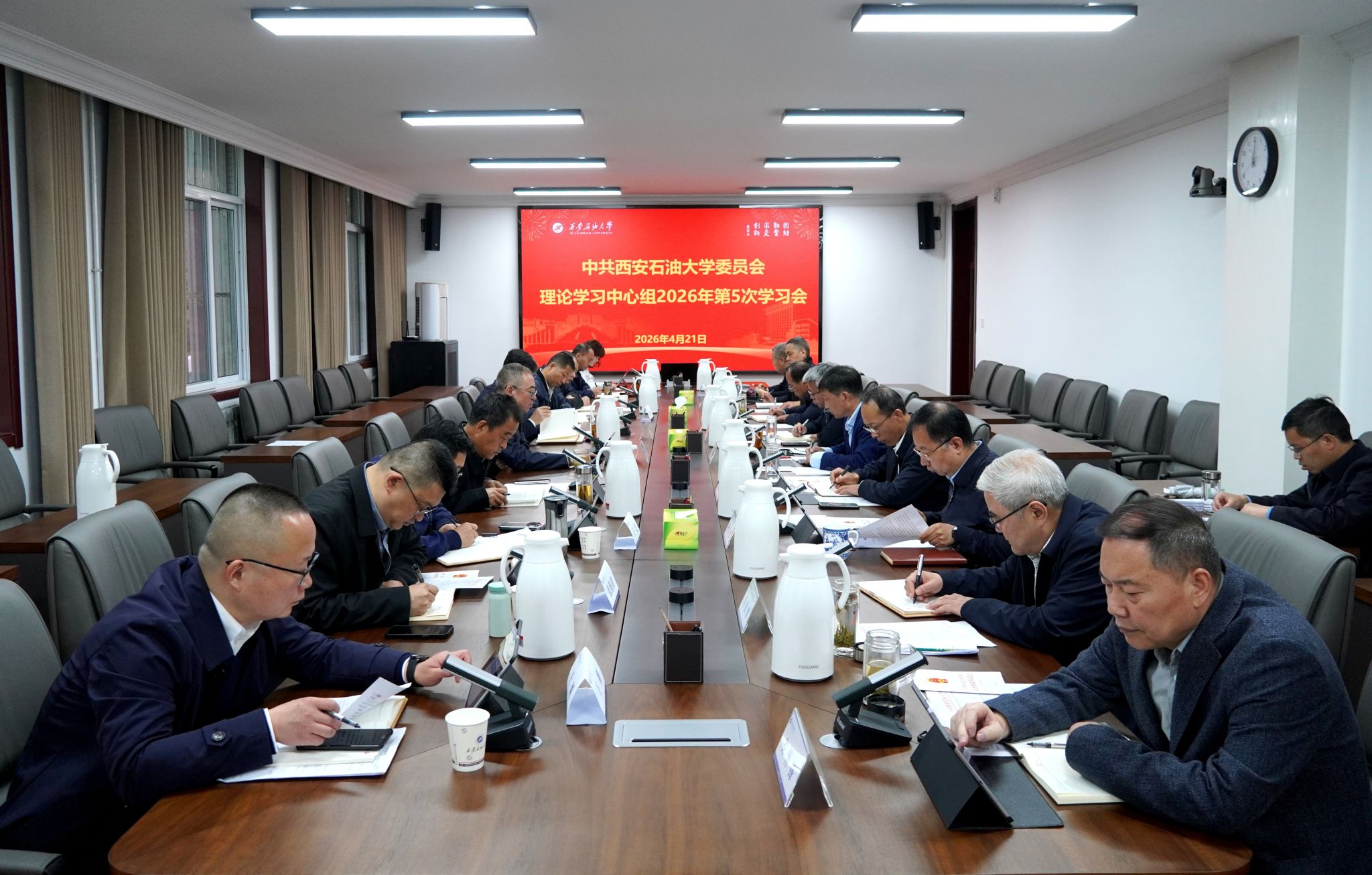 4月21日上午,校党委理论学习中心组2026年第5次学习会在鄠邑校区第三会议室召开,深入学习领会习近平总书记在河北雄安新区考察座谈时、对国家自然科学基金委员会工作作出的重要指示批示精神,学习中央、省委重要法规和文件精神,重温《习近平关于树立和践行正确政绩观论述摘编》相关篇目。校党委书记常江主持并讲话,校党委理论学习中心组成员参加会议。