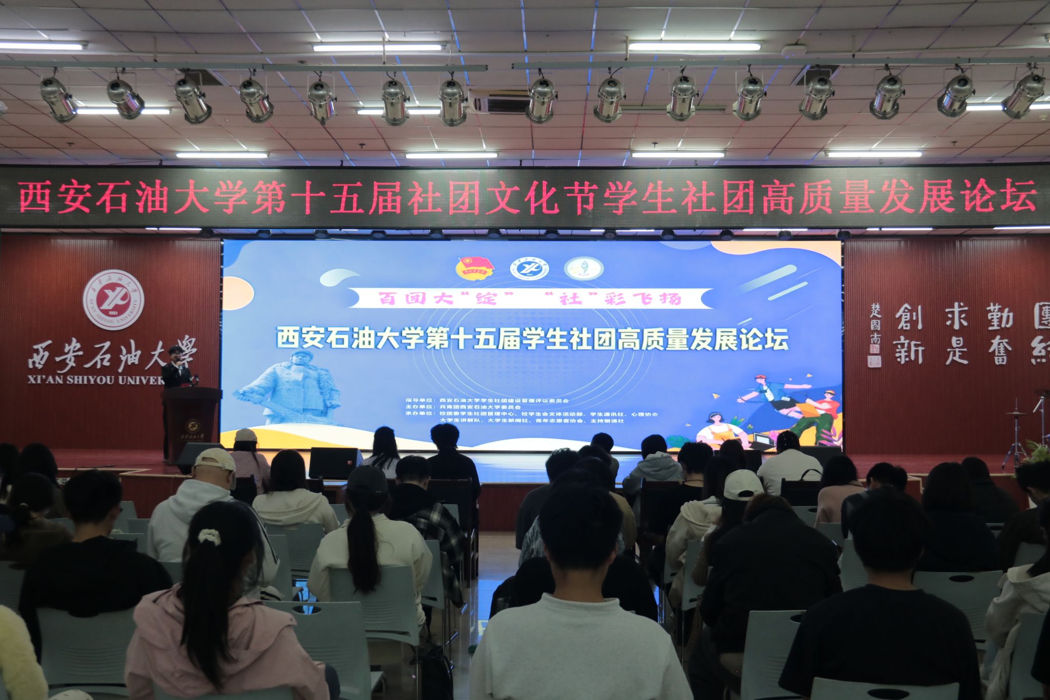 在鄠邑校区腾辉大学生活动中心举办的学生社团高质量发展论坛,校团委学生社团管理中心全体成员、学生社团负责人及成员代表300余人参加。社团管理中心负责人总结了2025年学生社团工作并介绍第十五届社团文化节活动内容。西北大学小黑戏剧工作室,西安建筑科技大学第二相声社,我校大学生讲解队、青年志愿者协会等优秀社团作社团文化建设与创新发展理念交流分享。