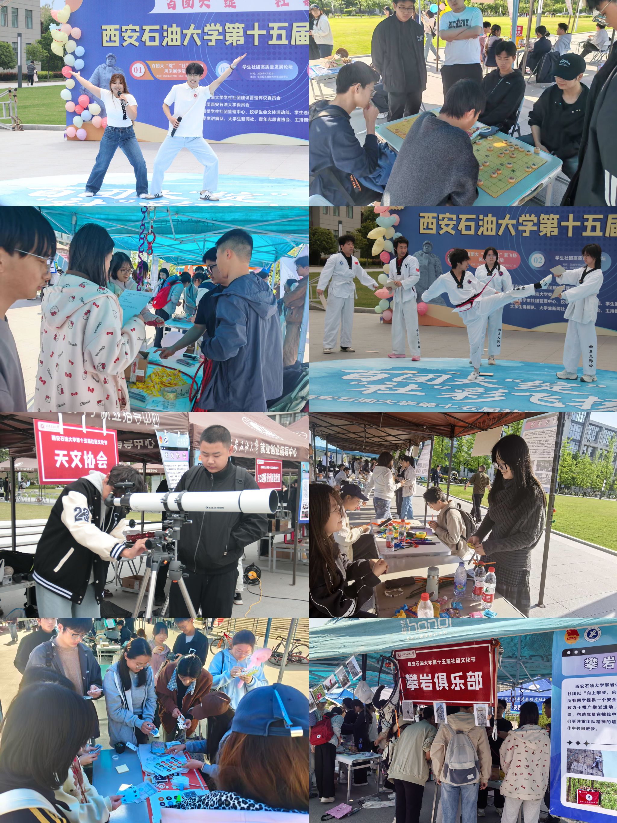 社团风采展示现场气氛热烈、青春飞扬。鄠邑校区初心广场上全校各学生社团集中亮相、各展所长。思想政治类、学术科技类、文化体育类、志愿公益类等社团轮番登场,带来互动体验、才艺展演、技能比拼等丰富活动。书法绘画、音乐演奏、趣味竞技、创意DIY、学术交流、工作展示等特色项目精彩纷呈,充分展现西石大学子多才多艺、昂扬向上的精神风貌,形成了“百花齐放、多元共融、充满活力”的校园社团文化生态。
