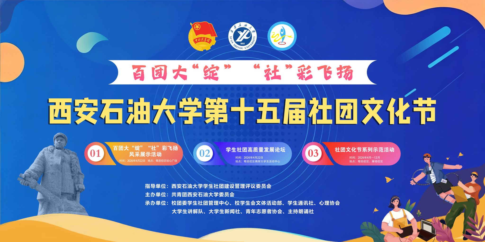 社团文化节作为我校“四节两进三会”校园文化品牌活动之一,是学校积极响应团中央“校园文化社团化”的号召,持续开展有内涵、有价值、有意义、有品牌的社团活动,充分发挥学生社团在人才培养质量提升中积极作用的具体体现。本届社团文化节以“百团大‘绽’‘社’彩飞扬 ”为主题,采用校院联动、社团主办、分级承办模式,围绕思想引领、文化浸润、能力提升、品牌培育四大主线,重点开展风采展示活动、学生社团高质量发展论坛、系列示范活动三大板块内容。社团文化节将持续全年,后续将陆续推出辩论赛、文艺展演、体育赛事、学术沙龙、志愿服务等一系列沉浸式、高品质社团示范活动。学校将以社团文化节为抓手,持续加强社团建设管理,不断提升社团育人实效,推动社团活动彰显特色、打造品牌,推动创新化、品牌化发展,为培养担当民族复兴大任的时代新人注入源源不断的青春动能。