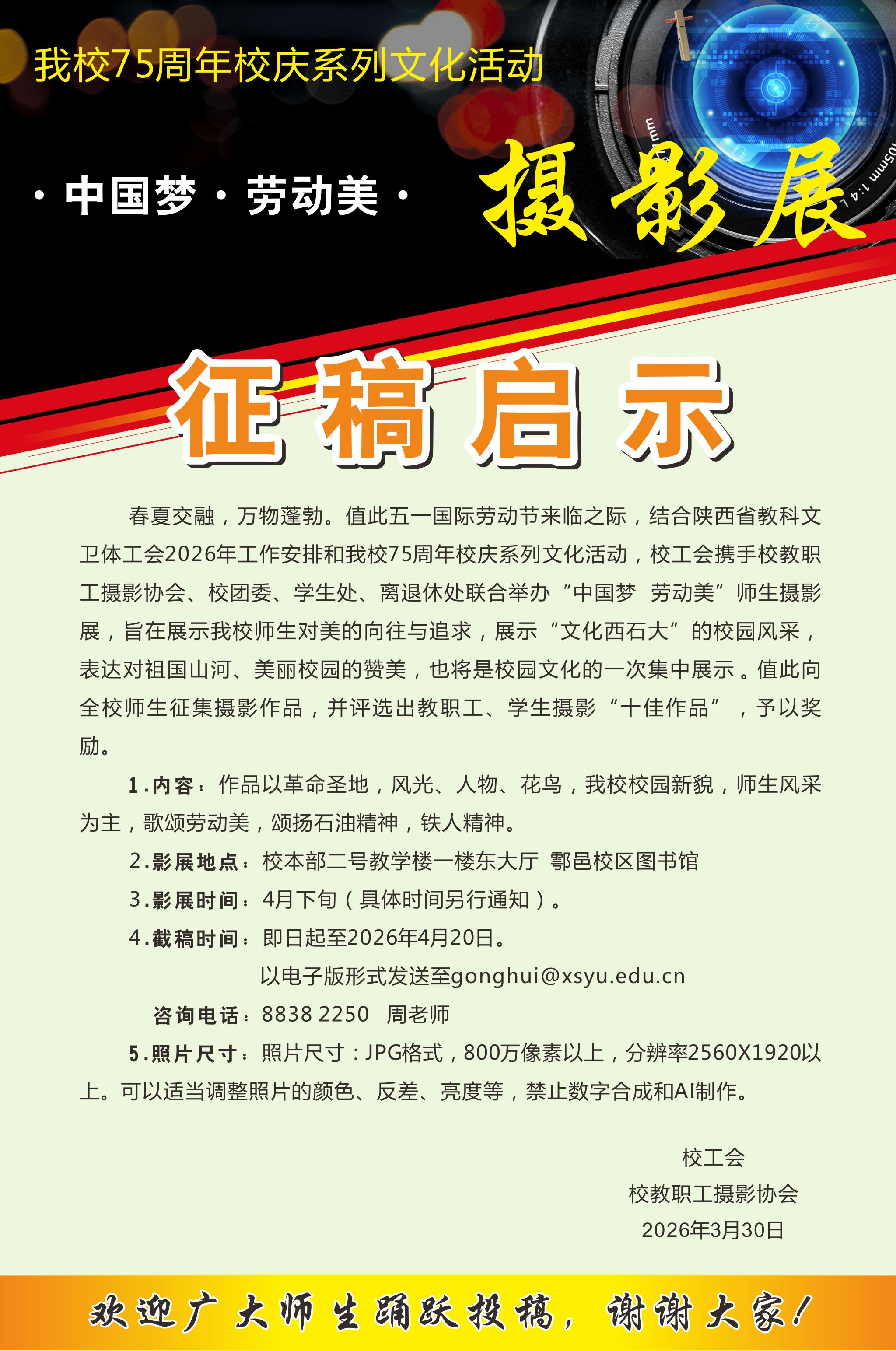 西安石油大学75周年校庆系列活动之 “中国梦 劳动美”师生摄影展征稿启示