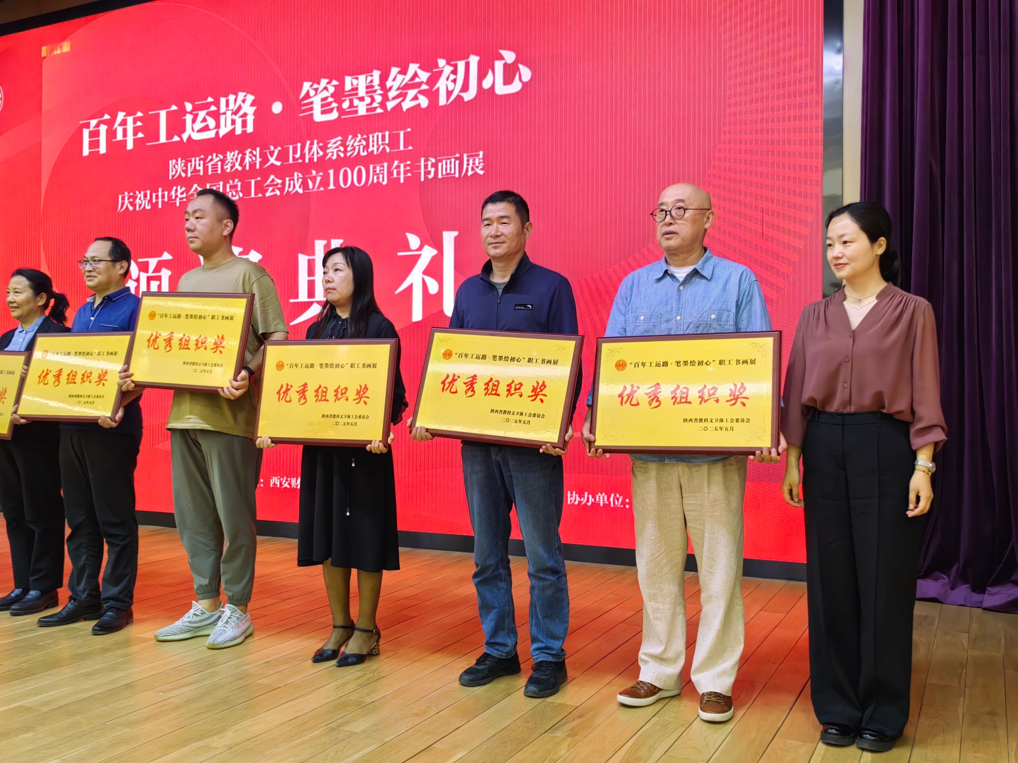 此次展览共展出书画作品162幅,充分展现了全省教科文卫体系统职工昂扬奋进的精神风貌和坚定不移听党话、跟党走的时代风采,同时以艺术的形式弘扬劳动精神、工匠精神,彰显工会百年发展成就,突出工人阶级伟大贡献。我校工会积极响应,学校书画爱好者积极创作并踊跃投稿,通过丹青墨韵生动诠释百年工运精神,充分展现全校教职工对工人阶级光辉历史的情感认同与使命传承。经展览组委会评选,我校工会荣获“百年工运路·笔墨绘初心”职工书画展优秀组织奖,同时,校工会周武老师荣获书法类优秀奖。