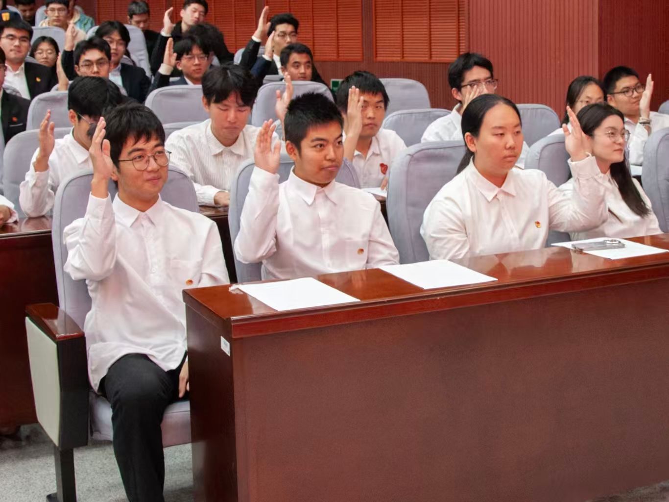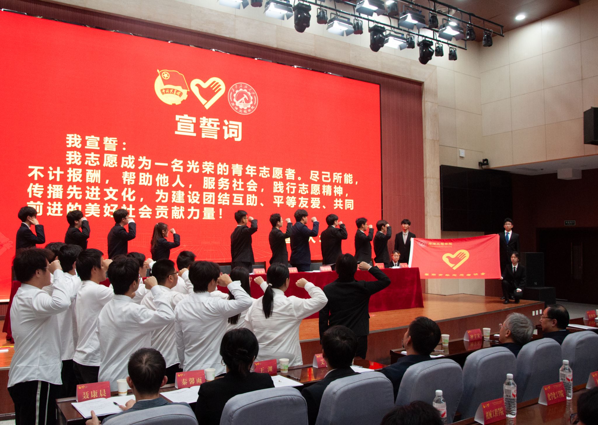 大会最后,全体志愿者高举右拳,进行集体宣誓,铿锵有力的誓言回荡在报告厅内,标志着石油工程学院春雨青年志愿者协会正式开启志愿征程。