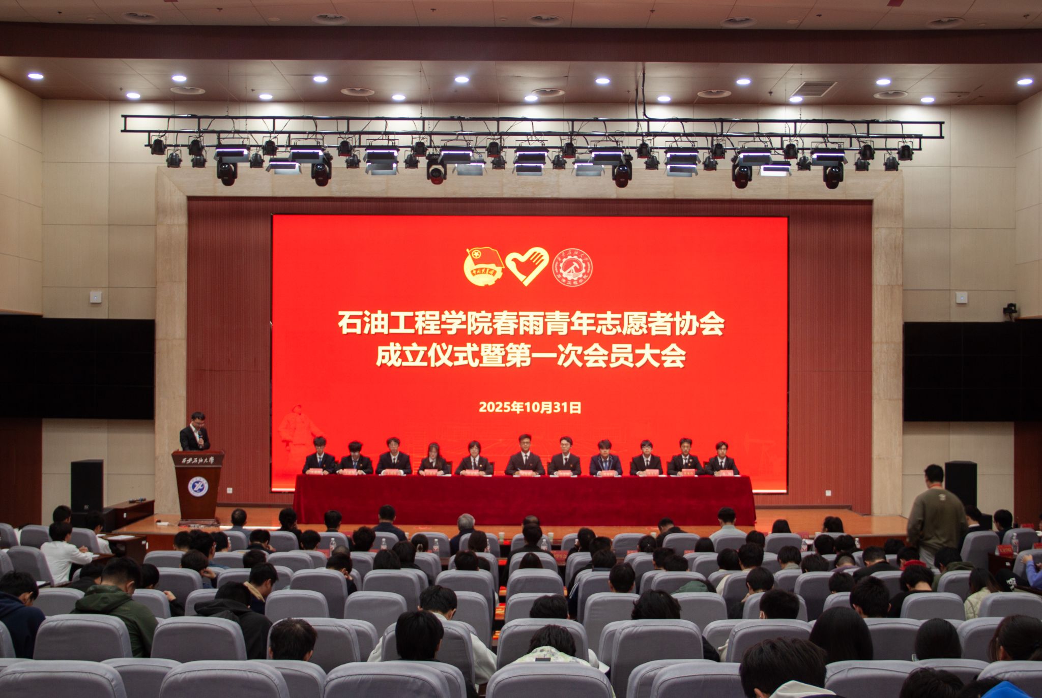 10月31日,石油工程学院春雨青年志愿者协会成立仪式暨第一次会员大会在鄠邑校区弘石学术报告厅隆重举行,副校长种宇宏,学院党委书记司马文龙,校团委副书记王军策,学院党委副书记艾二鑫,学生工作办公室全体老师,青年志愿者、各兄弟院系学生代表参加大会,会议由学院团委书记史阳主持。