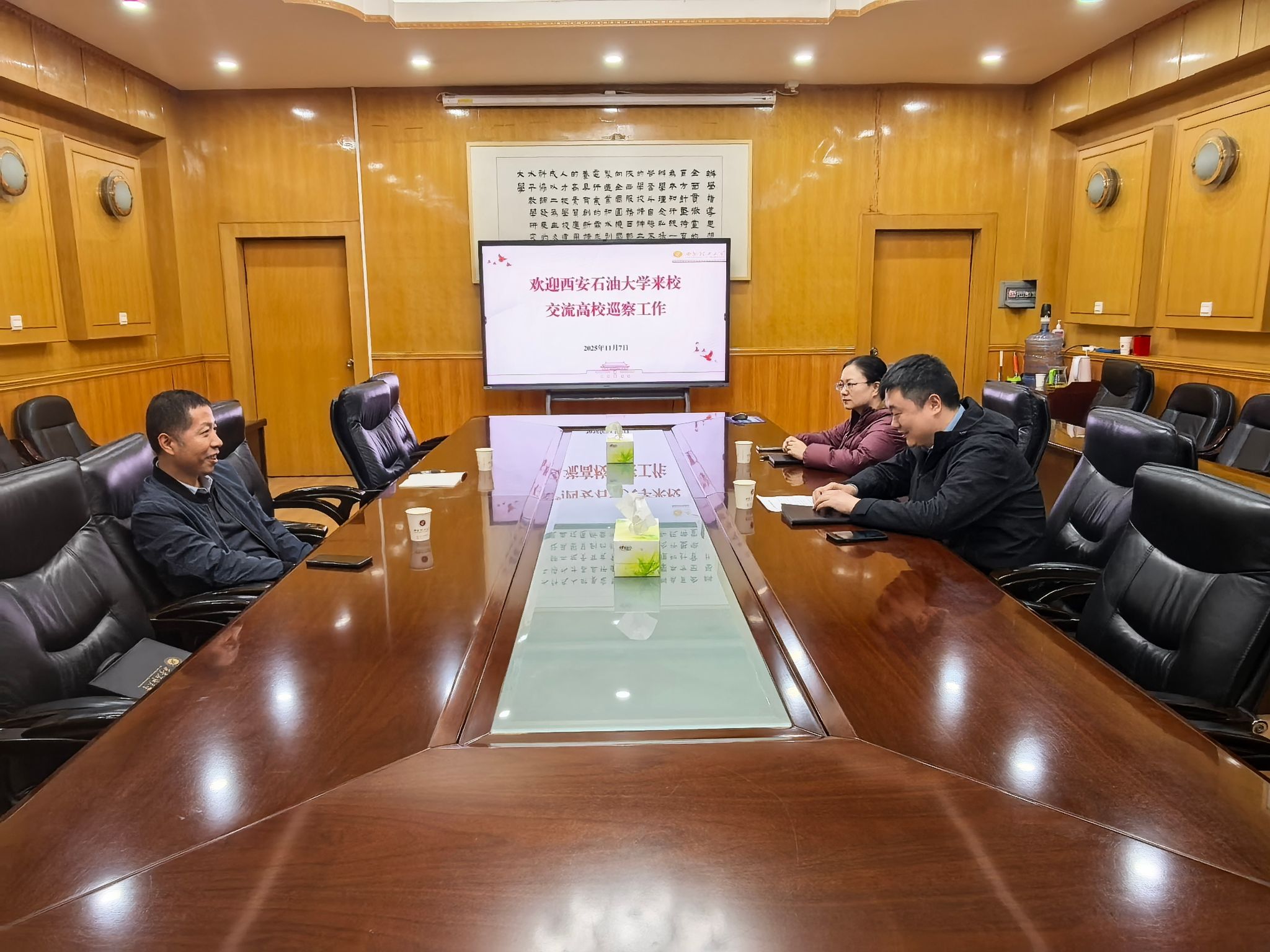 调研中,陕西科技大学巡察办主任高璐、西安工业大学巡察办主任梁闪慧、西安理工大学巡察办主任王博对我校巡察办一行表示欢迎。在座谈交流中,我校巡察办与三所高校巡察办就各自校内党委巡察工作队伍建设有关情况,校内巡察工作开展优化工作流程、改进方式方法、增强巡察监督精准性和有效性等方面情况,针对院系党委、机关党委和后勤党委等不同类型党组织巡察观测点制定有关情况,加强对“一把手”和领导班子监督有关情况,组织开展专项巡察、机动巡察等情况以及巡察整改及督查评估工作等情况展开深入交流研讨。苟毅飞表示,希望我校与三所高校进一步加强交流合作,互相学习借鉴,创新思路举措,共同推动学校巡察工作高质量发展。