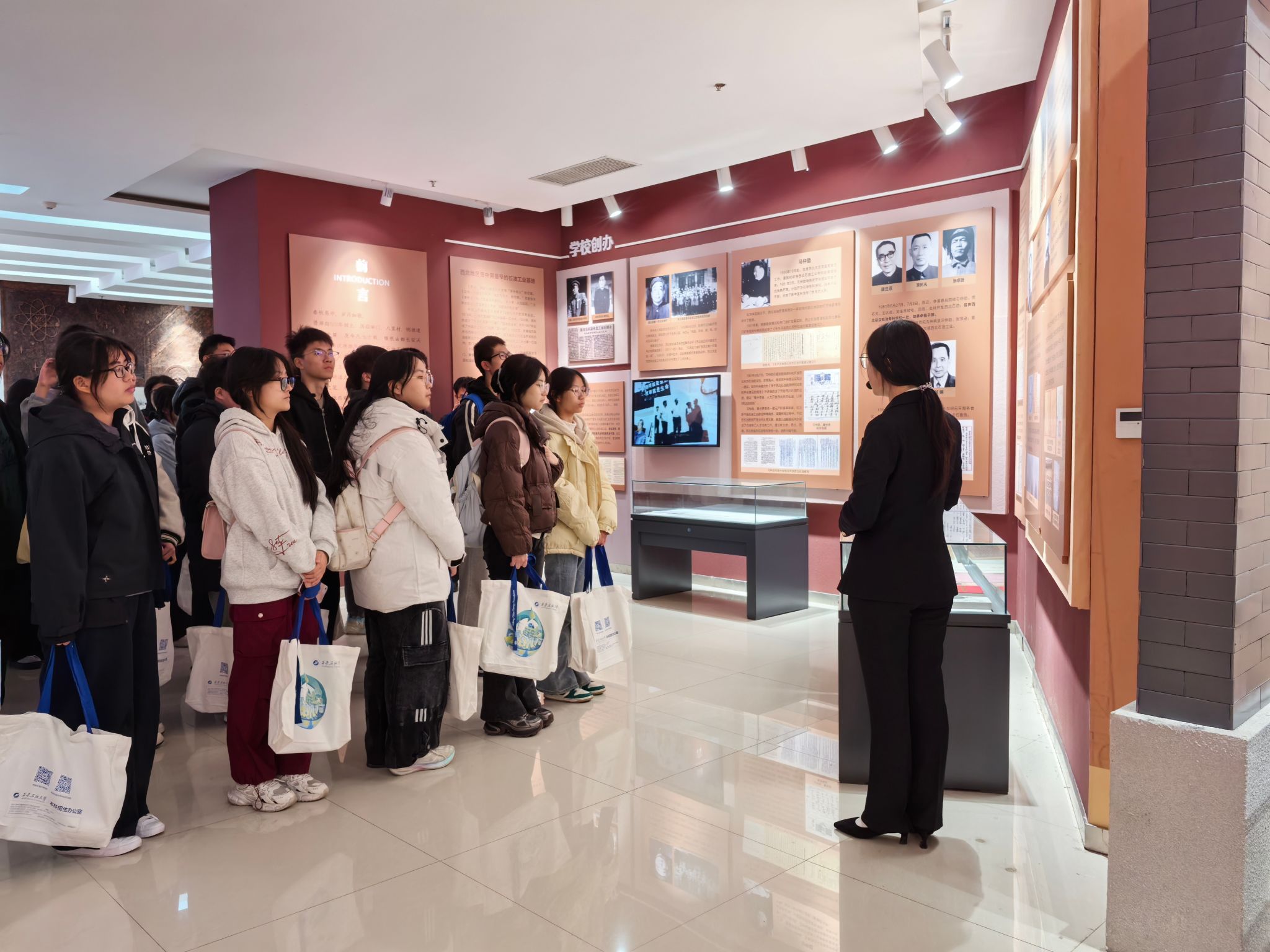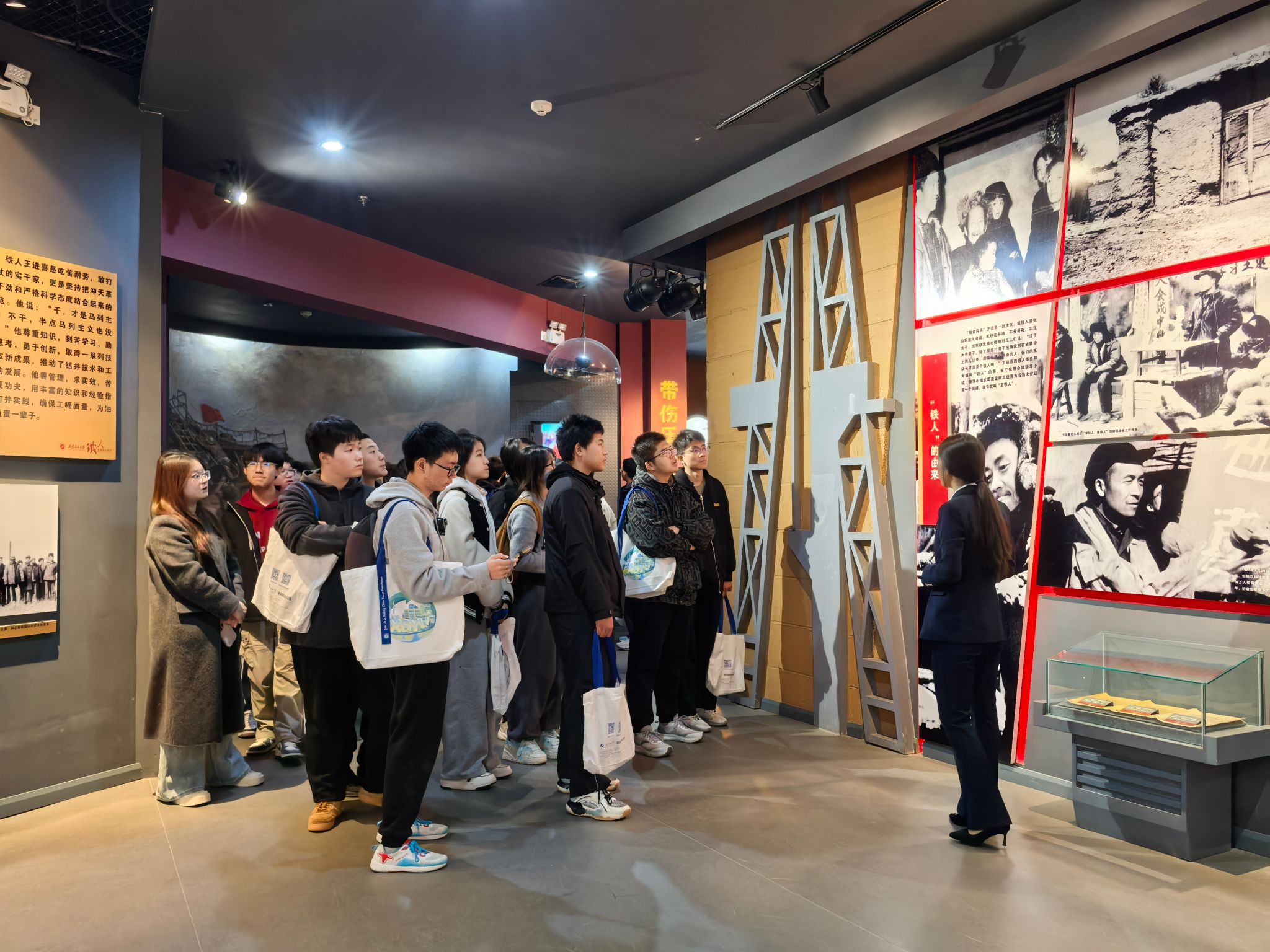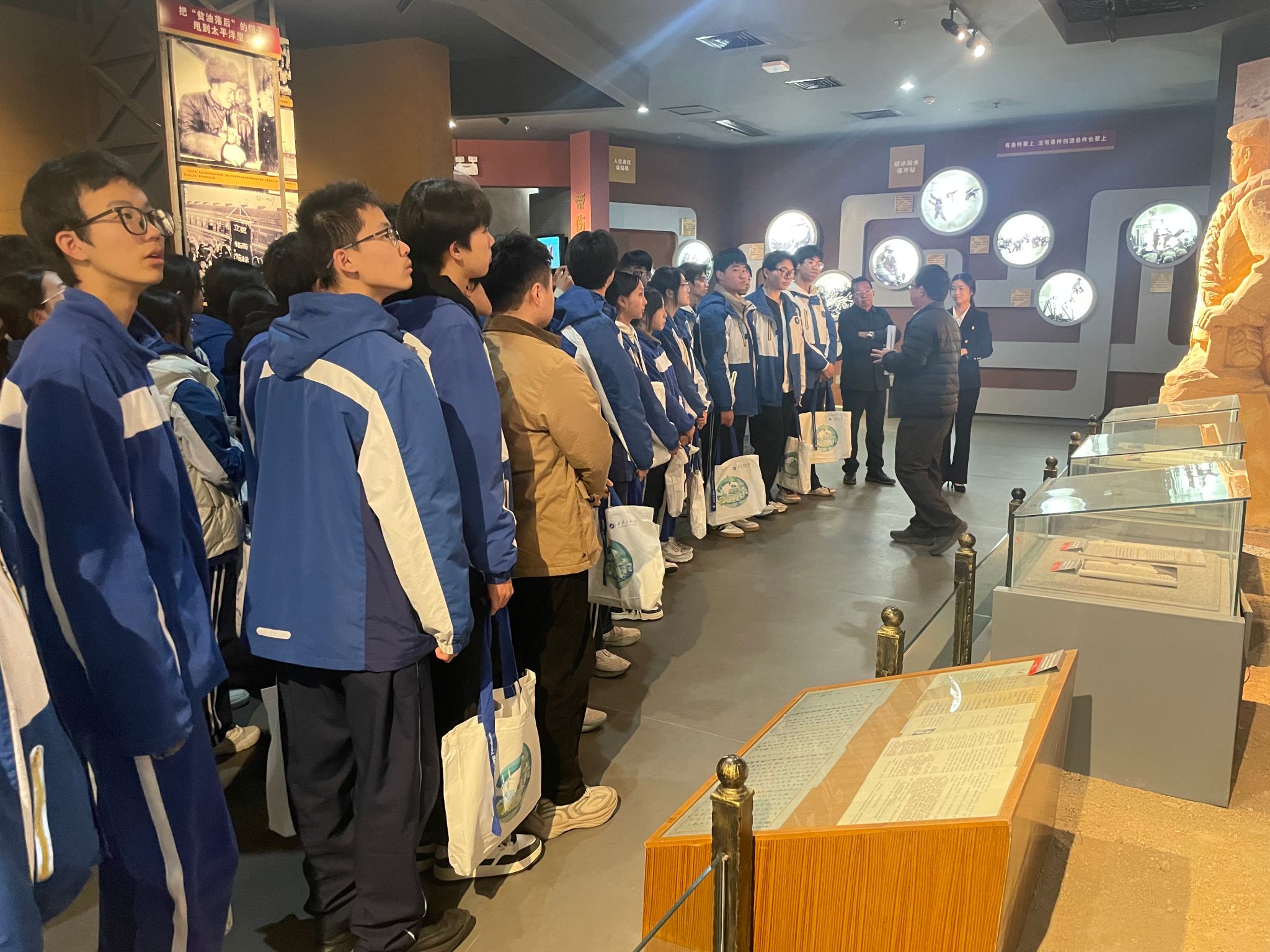 研学活动第一站首先来到校史馆和铁人纪念馆。在铁人纪念馆,通过讲解员细致的讲解,结合一幅幅珍贵的照片、一件件实物展品,五高师生深切感受了铁人的不凡人生历程,深刻领悟了铁人精神的内涵。在校史馆,跟随讲解员的步伐,五高师生认真聆听了学校的建设发展历程,透过一个个展板,一件件历史实物,大家学习了先辈们筚路蓝缕艰苦办学的奋斗精神,专家学者潜心育人的优秀事迹和毕业生扎根祖国大地回馈社会的爱国情怀,深切感受到我校的校园文化和学习氛围,也激发起内心对大学生活的向往和憧憬。