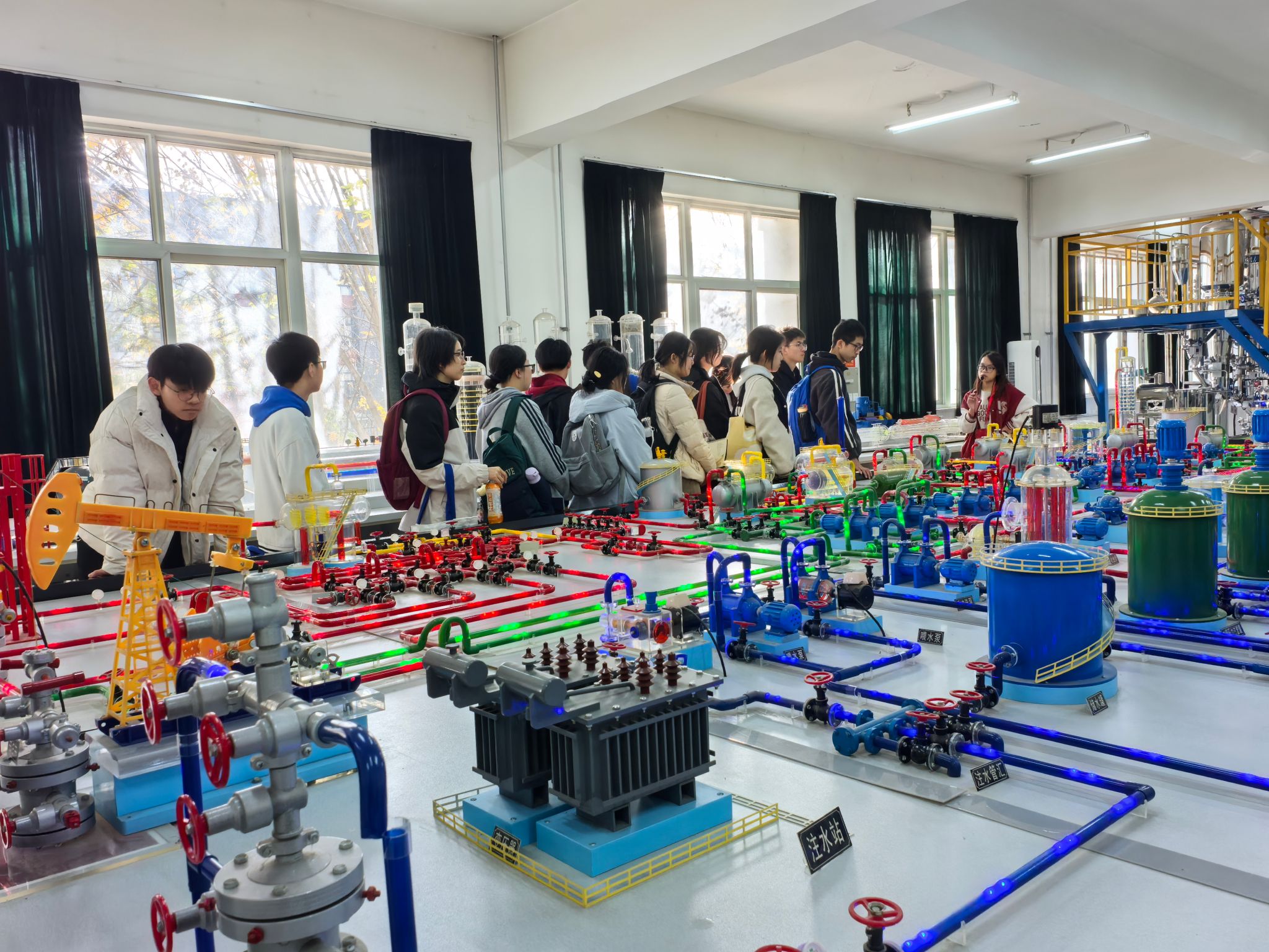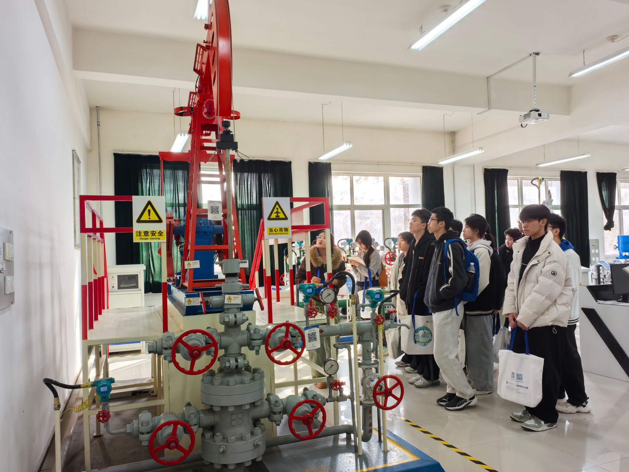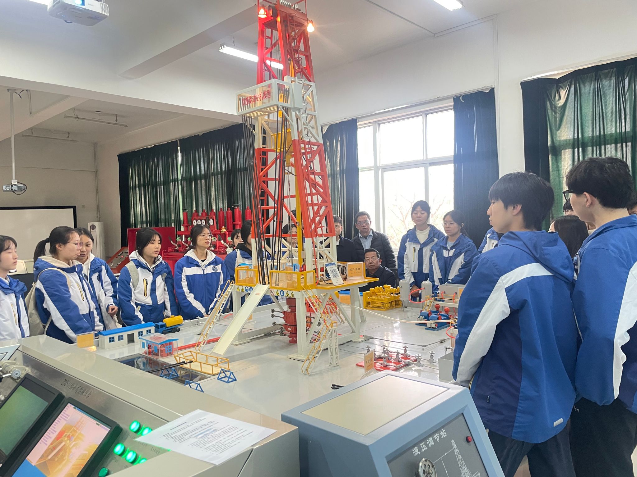 研学活动最后一站参观了我校陕西省石油石化虚拟仿真实验教学中心。在大学生讲解员的带领下,五高师生参观了钻井实训室、地质标本实训室、采油实训室、油气分布沙盘、集输、炼化实训室、采油实训室。通过参观学习,学生初步了解了石油勘探、开采、炼化和运输的全过程,近距离感受到了石油石化及地质行业的魅力与挑战。