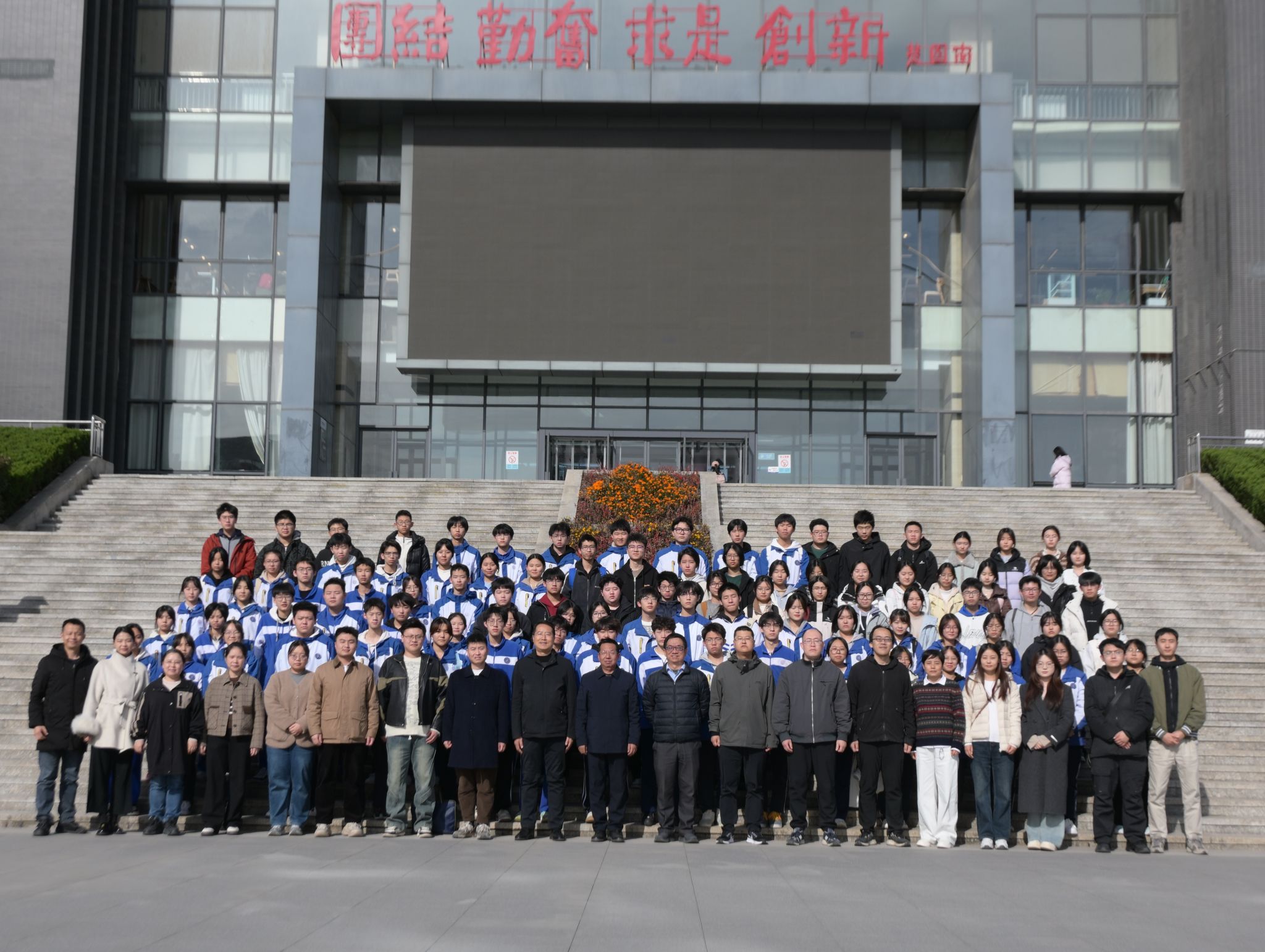 2025年11月19日下午,西安高新区第五高级中学(以下简称五高)受邀来我校开展研学活动,校长刘占权带领师生代表100余人参加活动。理学院招生宣传工作组代表学校接待五高师生并在鄠邑校区第一会议室举行简短的欢迎仪式。理学院党委书记席利哲、副院长马儇龙、理学院教授兼五高科技副校长郭文阁及理学院教师代表参加欢迎仪式。欢迎仪式开始前,与会人员在图书馆南门台阶前合影留念。欢迎仪式上,席利哲代表学校及理学院对五高师生代表的到来表示热烈欢迎,并简要介绍了研学活动行程和学校概况。