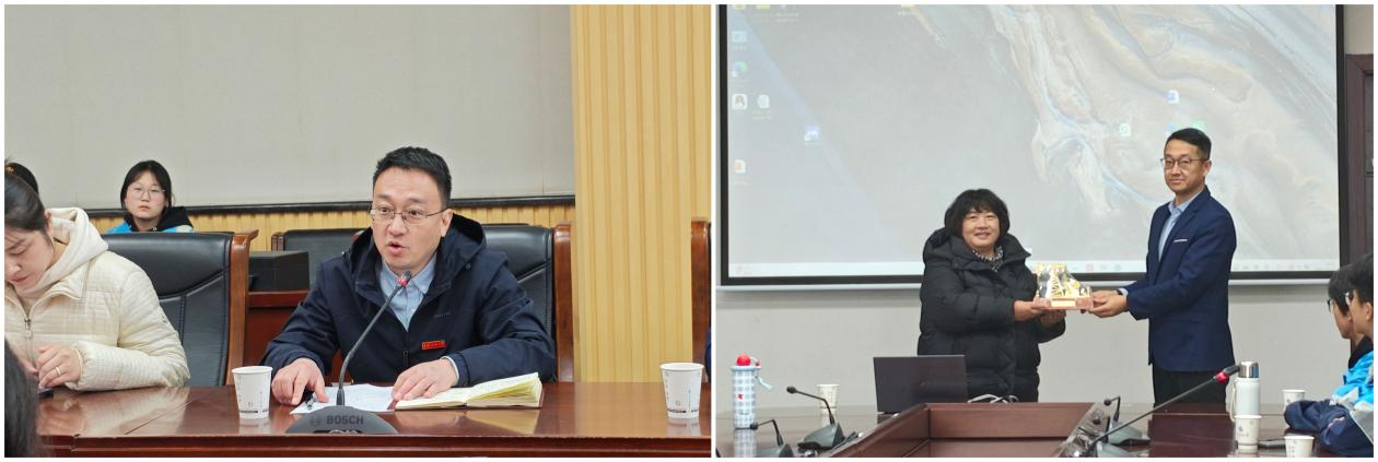 上午10时,活动在图书馆东门阶梯合影中拉开序幕。在图书馆第二会议室,大家共同观看西安石油大学宣传片,全面了解学校的发展历程、学科特色与育人成果。在欢迎仪式上,电子工程学院教学副院长任志平致欢迎辞,对岳庙高级中学师生的到来表示热烈欢迎,并简要介绍了学院的基本情况与办学优势。随后,电子工程学院党委副书记芮执根代表学院向中学师生赠送抽油机模型,象征着石油工业精神的传承与两校友谊的延续。
