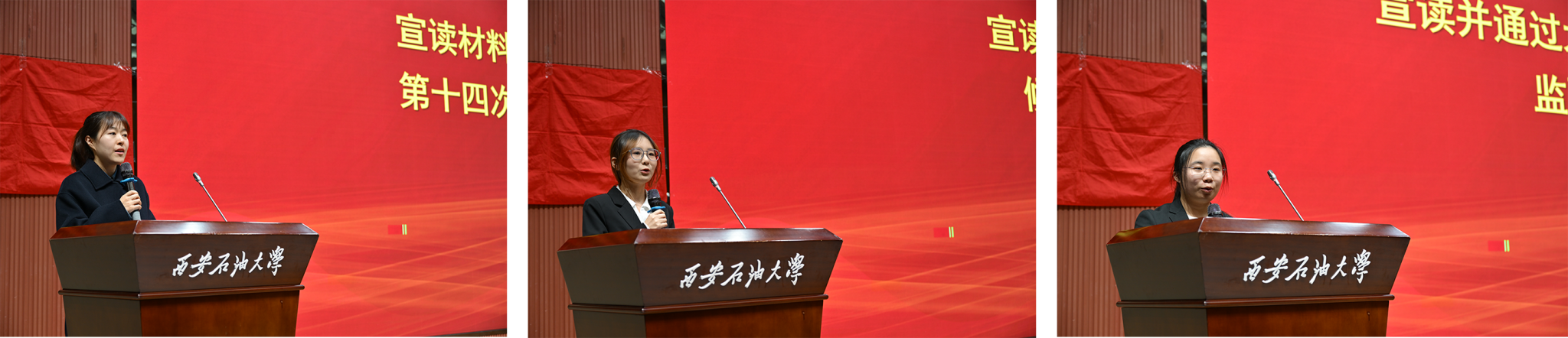 2024级团总支书记马黎宣读《材料科学与工程学院第十四次学生代表大会选举办法》,第十三届团委副书记祁战梅宣读《材料科学与工程学院第十四次学生代表大会学生会委员会候选委员名单》,第十三届团委副书记权禾萌宣读《大会总监票人、总计票人、监票人、计票人名单》并提交大会审议。