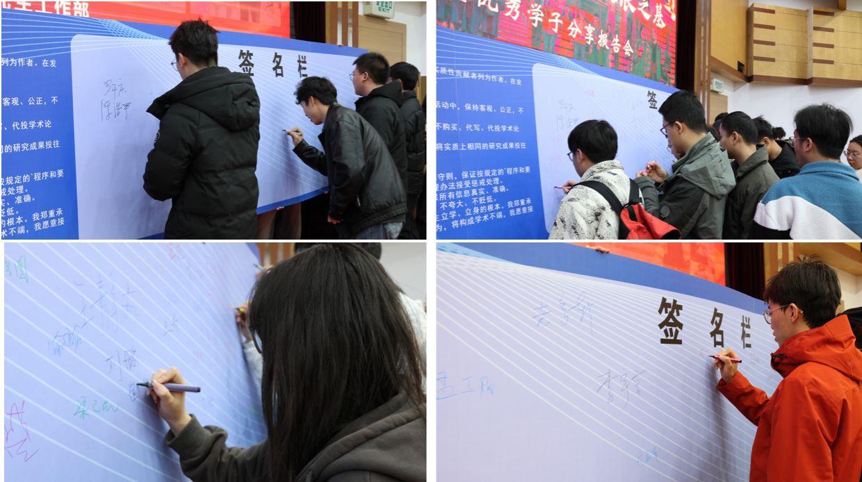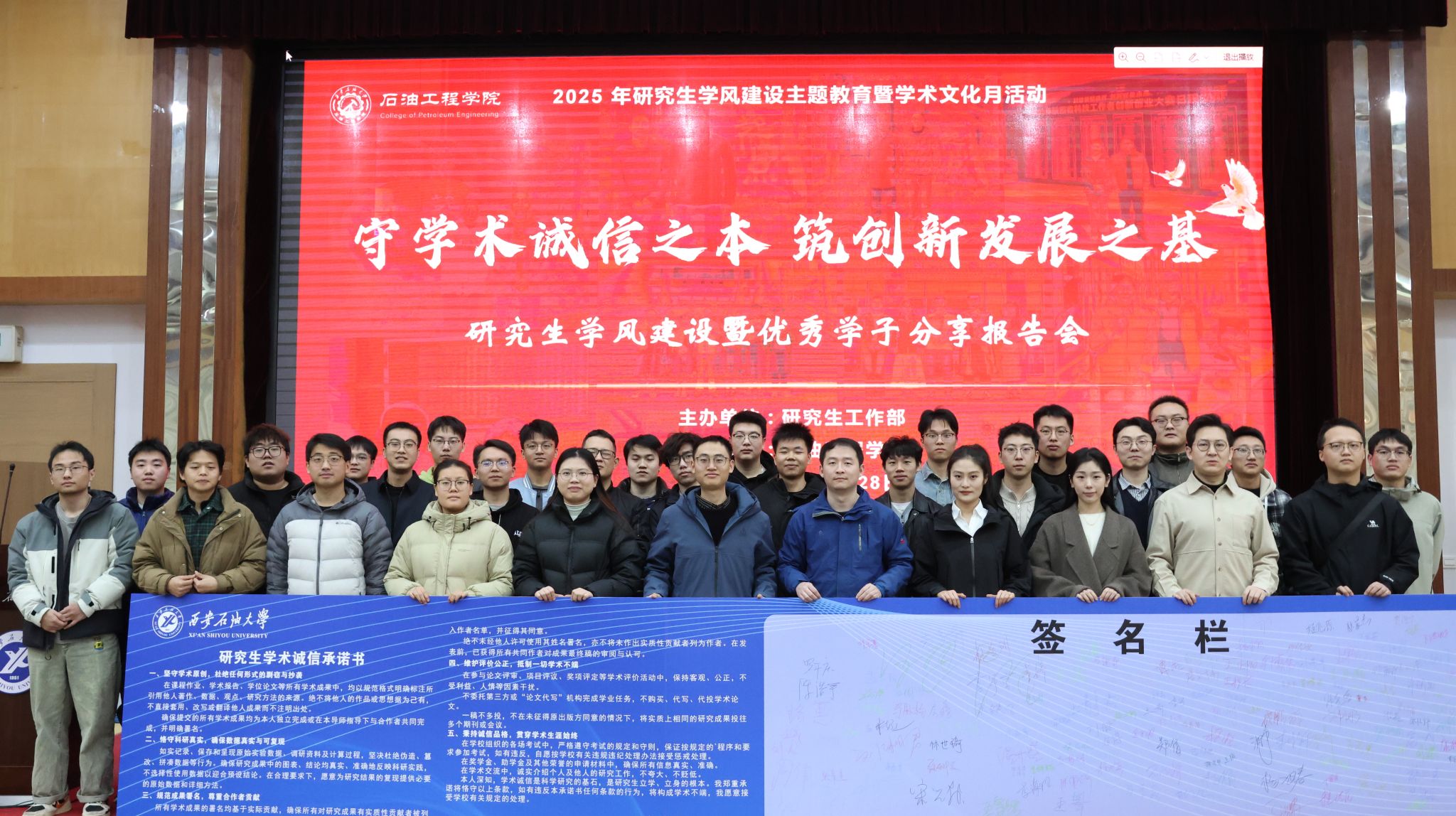 最后,石油工程学院研究生辅导员宋兴淼在会上为全体研究生通报了近期全国高校中发生的学术不端案例,开展学术诚信警示教育,全体研究生依次签署学术诚信承诺书并合影留念。