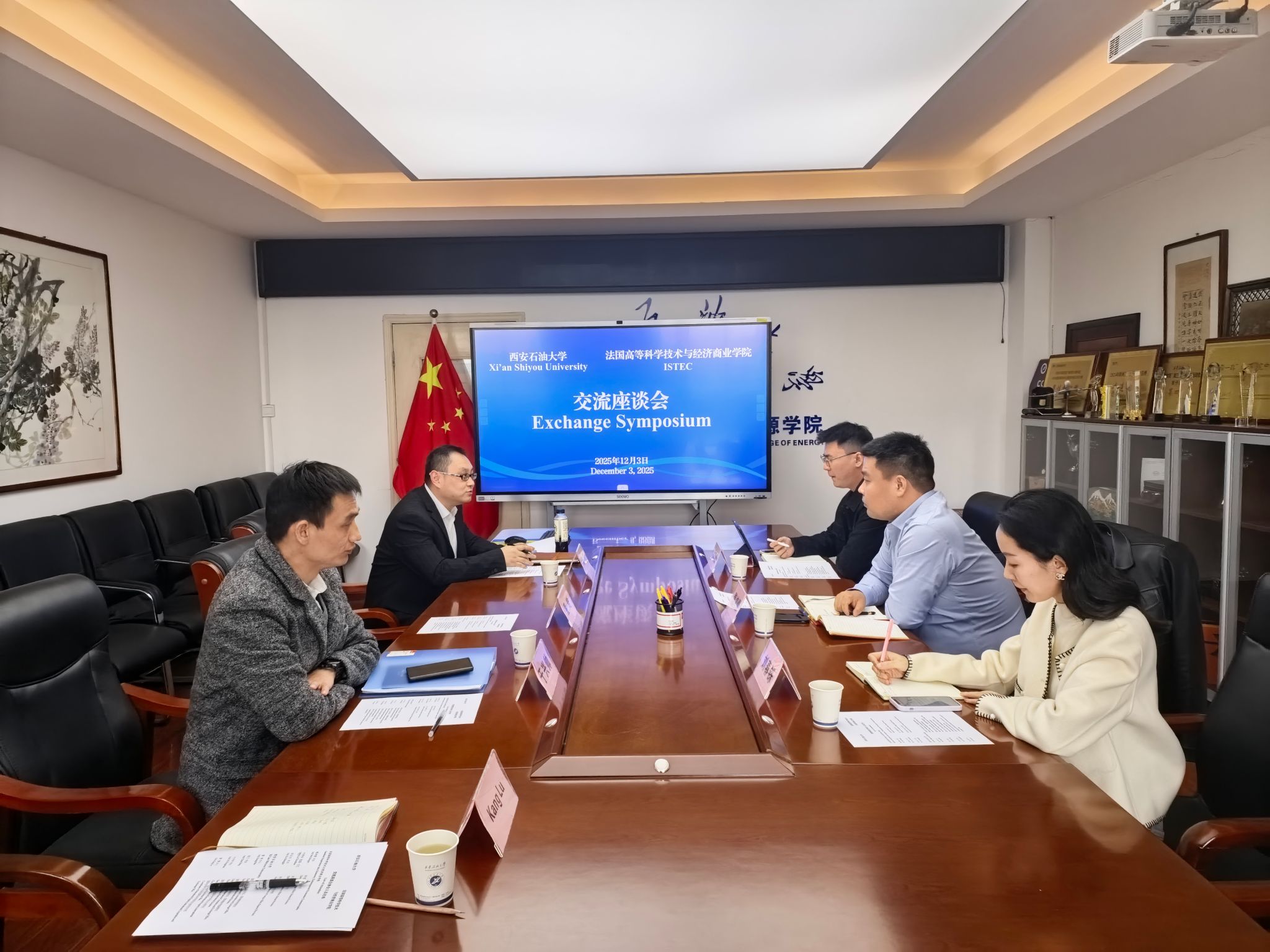 12月3日下午,法国高等科学技术与经济商业学院代表团来我校交流座谈。法国高等科学技术与经济商业学院陕西省外事主任魏鸿儒、四川省教学主任刘春铄、陕西省外事主任助理徐圣杰,我校国际合作与交流处领导及相关工作人员参会。