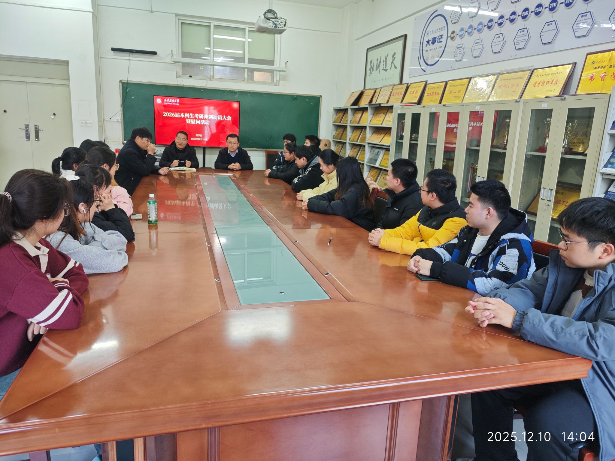 冬日砺剑,蓄势待发;“研”途护航,温暖同行。时值2026届研究生考试冲刺攻坚的关键节点,为进一步激励考研学子坚定信念,以最佳状态迎战决胜之战,12月10日下午,理学院考研冲刺动员会暨考研慰问活动在鄠邑校区志远楼111会议室举行。学院党政领导席利哲、折延宏、杨富民参加动员会,向即将踏上考研征程的考研学子代表送上暖心关怀与殷切期许。