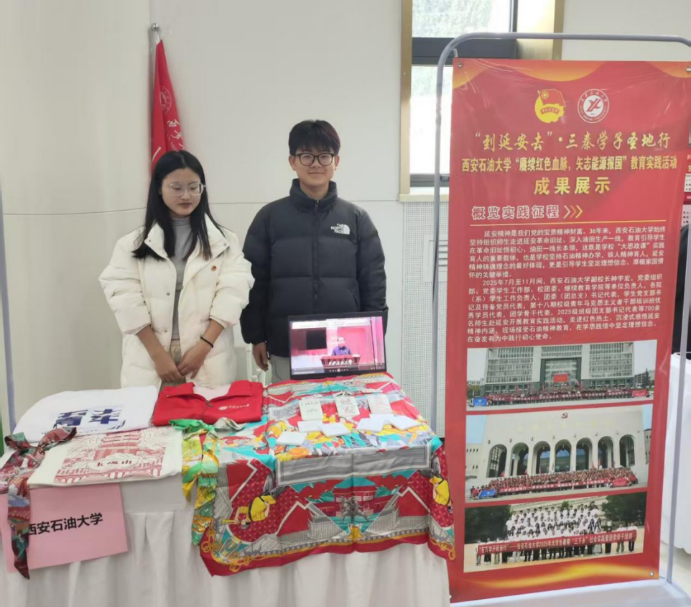 在实践成果展示环节,我校展位通过精心制作的宣传展板和生动丰富的实践活动资料,全面呈现了我校近年来在实践育人方面取得的扎实成果。特别是我校学生基于延安社会实践成果自主设计的丝巾、帆布包、文化衫、卡套等系列文创产品,将红色文化基因与青年创意设计相融合,以生动鲜活的实物形态展现出革命圣地的文化魅力与我校学子的精神风采,吸引了众多领导、嘉宾和兄弟院校师生的驻足欣赏与交流,成为展会现场备受关注的亮点之一,获得了广泛赞誉。
