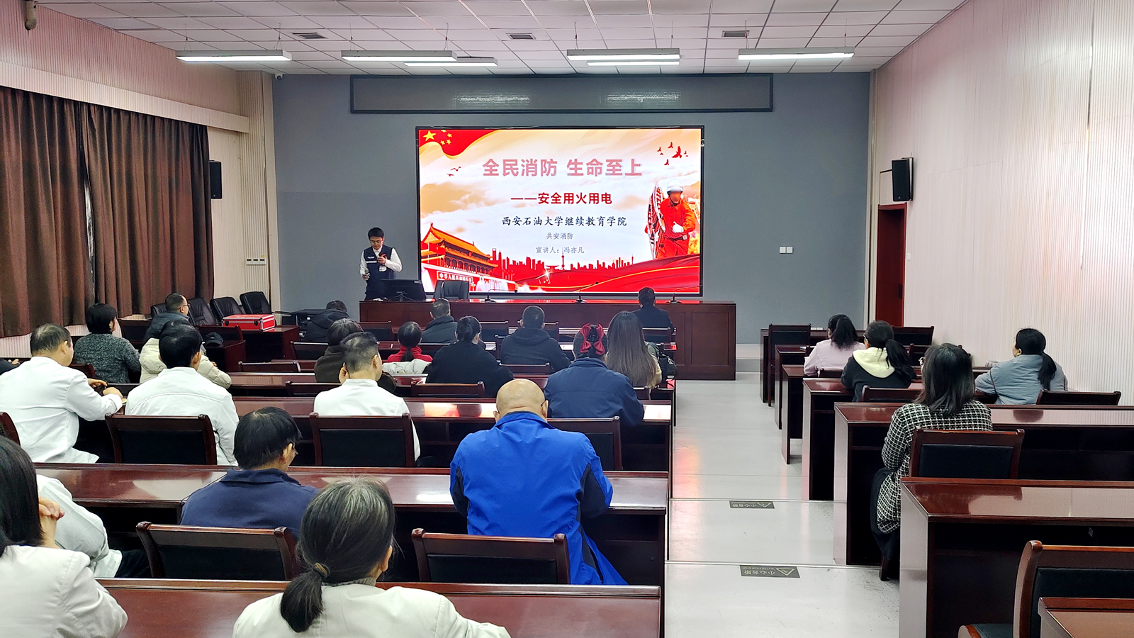 加强消防培训,强化处置能力。邀请消防专家为全体教职工和第三方员工开展了消防安全知识专题讲座,对火灾的危害、成因、预防措施及初期应急方法进行了系统介绍,重点培训了火灾发生时的正确应对方法,如迅速报警、科学灭火、安全逃生等,现场演示了消防器材的正确操作流程。通过培训,进一步增强了消防安全意识,提高了现场应急处理能力,让大家对消防安全工作有了更全面、更深刻的认识。