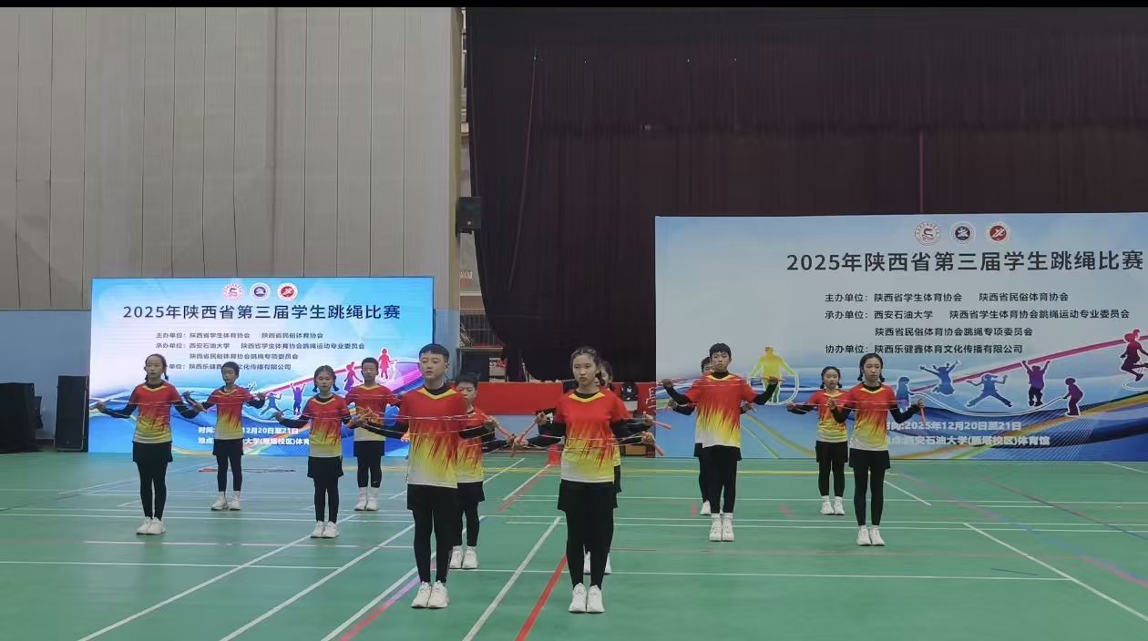 12月20日-21日,时维仲冬,盛会襄举。三秦学子负凌云之志、八方绳友怀赤子之心,荟萃西安石油大学雁塔校区,共赴2025年陕西省第三届学生跳绳比赛。赛事由陕西省学生体育协会、陕西省民俗体育协会联合主办,西安石油大学、陕西省学生体育协会跳绳运动专业委员会、陕西省民俗体育协会跳绳专项委员会共同承办,陕西乐健鑫体育文化传播有限公司协办。开幕式上,我校体育学院院长李寿邦送上祝愿:“祝愿各年龄段祖国的花朵们茁壮成长,也祝愿本次比赛圆满成功,祝愿运动健儿取得优异的成绩。”同时,他表示:“西安石油大学将持续为陕西体育发展贡献西石大力量!”。