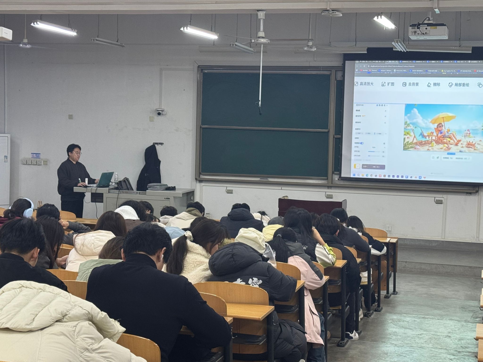 讲座中,主讲人结合丰富案例,围绕设计类专业学生关注的核心问题展开讲解,内容分为四大板块:一是分析视觉传达、环境设计等专业当前的就业方向与市场需求,明晰行业人才标准;二是聚焦“人工智能是否将替代设计行业”的热点话题展开深入探讨,引导学生理性看待技术变革;三是系统讲解人工智能技术在设计领域的实际应用场景与现代化工作流程,拆解AIGC辅助设计的实操要点;四是结合行业发展趋势,阐述高质量就业所需的核心能力与素质准备,为学生的技能提升指明方向。