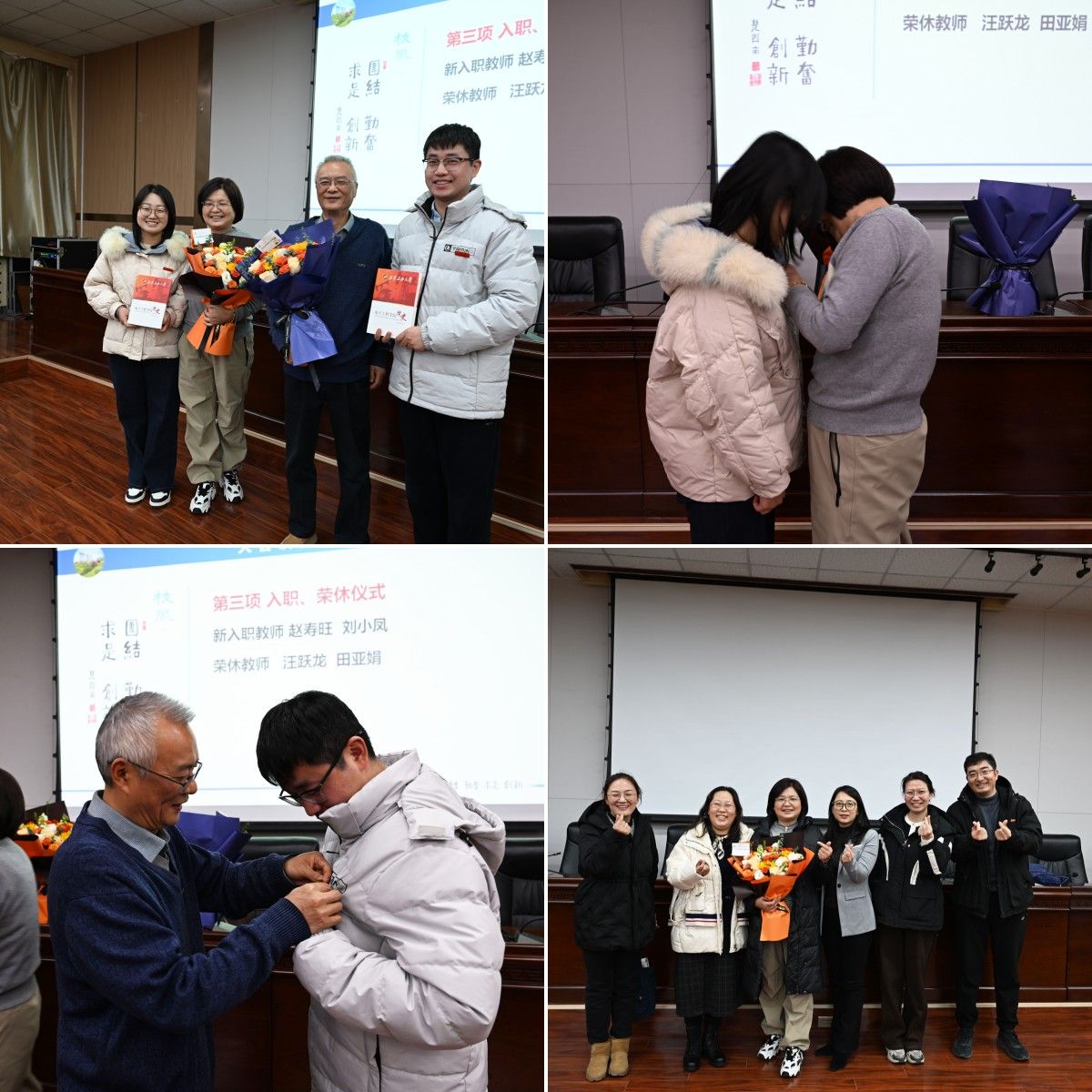 在大会第三项温馨而庄重的入职与荣休仪式中,新入职教师赵寿旺、刘小凤受到热烈欢迎,退休教师汪跃龙、田亚娟在掌声中接受敬意与祝福,并亲自为新教师佩戴校徽、赠送院史,象征学院精神薪火相传。学院对荣休教师多年来为学院发展作出的贡献表示衷心感谢,并鼓励新教师传承学院优良传统,续写事业发展新篇章。