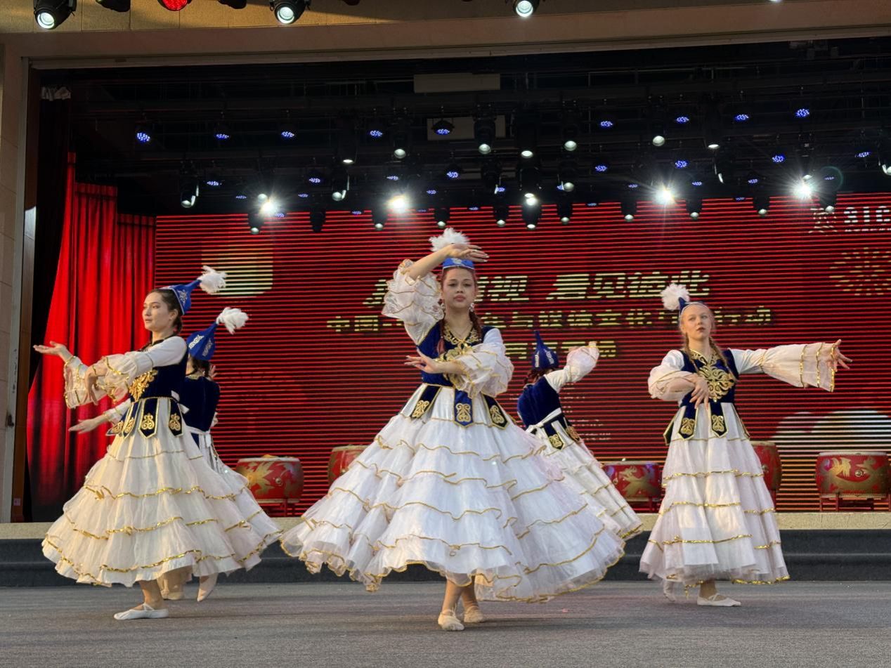 在中华郡大舞台,中外文化交流持续升温。俄罗斯留学生苏菲等5人带来节目《礼物》,吉尔吉斯斯坦留学生爱苏、爱悦献上舞蹈《阿桑巴丁・埃莱西》,掌声不断。