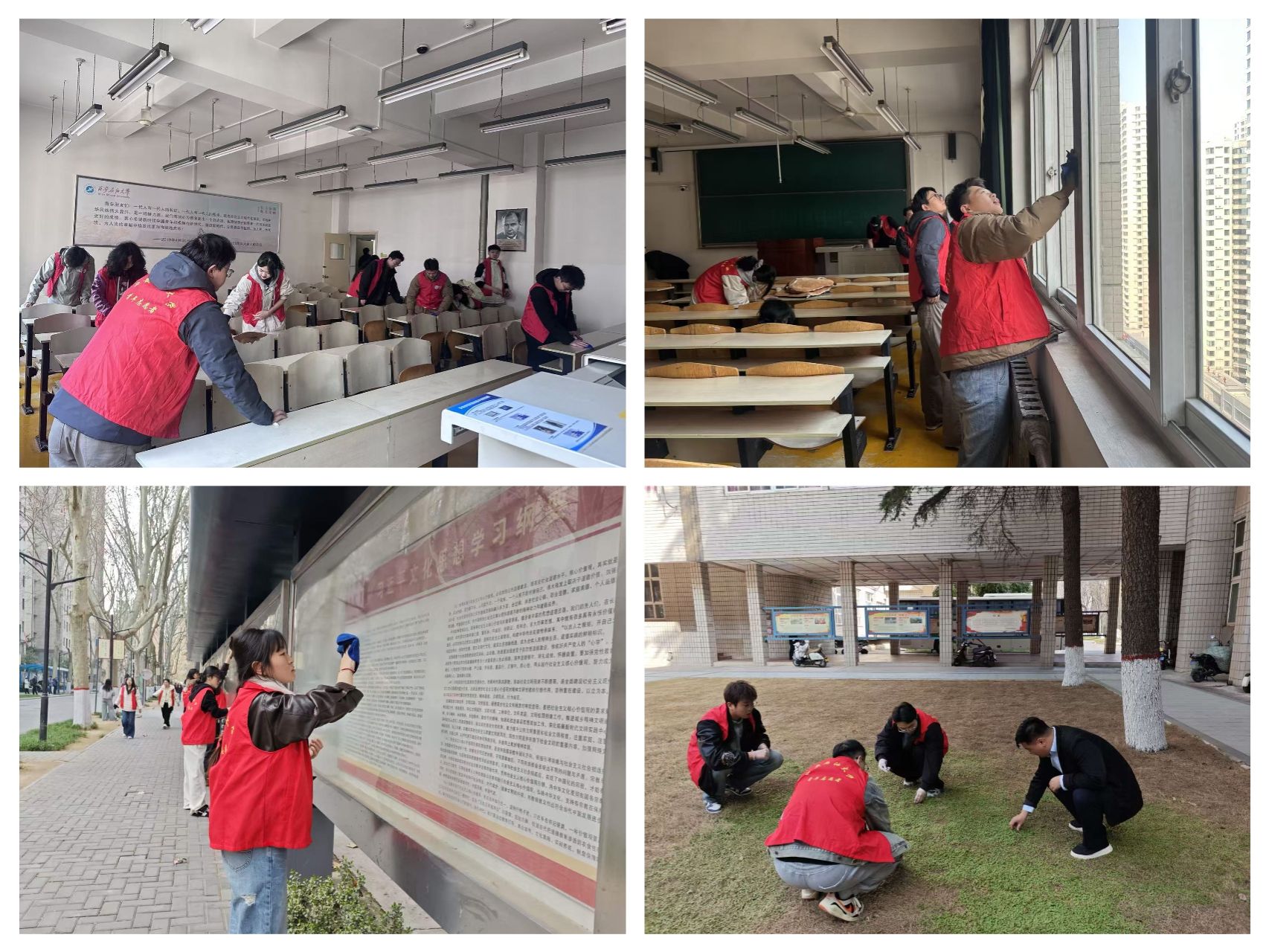 同日,后勤处联合石油工程学院,组织50余名学生志愿者开展教学楼保洁与校园环境美化专项行动。活动中,志愿者们分工协作、干劲十足:在教学楼内,大家认真擦拭门窗、讲台,清理黑板与课桌,细致打扫卫生死角;在校园公共区域,志愿者们捡拾绿化带内垃圾、烟头,清理铁人广场、春雨园草坪杂草,并擦拭宣传栏。通过共同努力,教学楼更加窗明几净,校园环境也更加整洁清新。