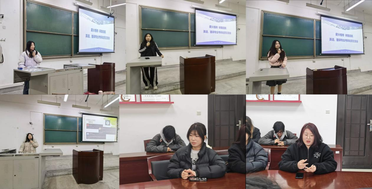 交流会上,受邀分享的优秀学姐们结合自身备考经历,从报考择校、复习规划、心态调整、资料选择等多个关键环节倾囊相授,干货满满。英语翻译专业方向,张卓怡详细讲解了长安大学外国语言文学专业的报考难度、参考书目及复试重点,分享了如何平衡专业基础与翻译能力的提升技巧;孙倩茹聚焦西北大学英语笔译专业,拆解了笔译备考的核心要点,结合真题实例讲解了翻译技巧与答题规范;李小兰针对本校英语笔译专业,分享了备考的时间规划的复习节奏,建议学弟学妹们立足本校优势,夯实基础、科学备考;代佳饶则分享了自己的支教保研经历,从支教工作要求、保研申请流程、材料准备等方面,为有保研意愿的学子提供了清晰指引。