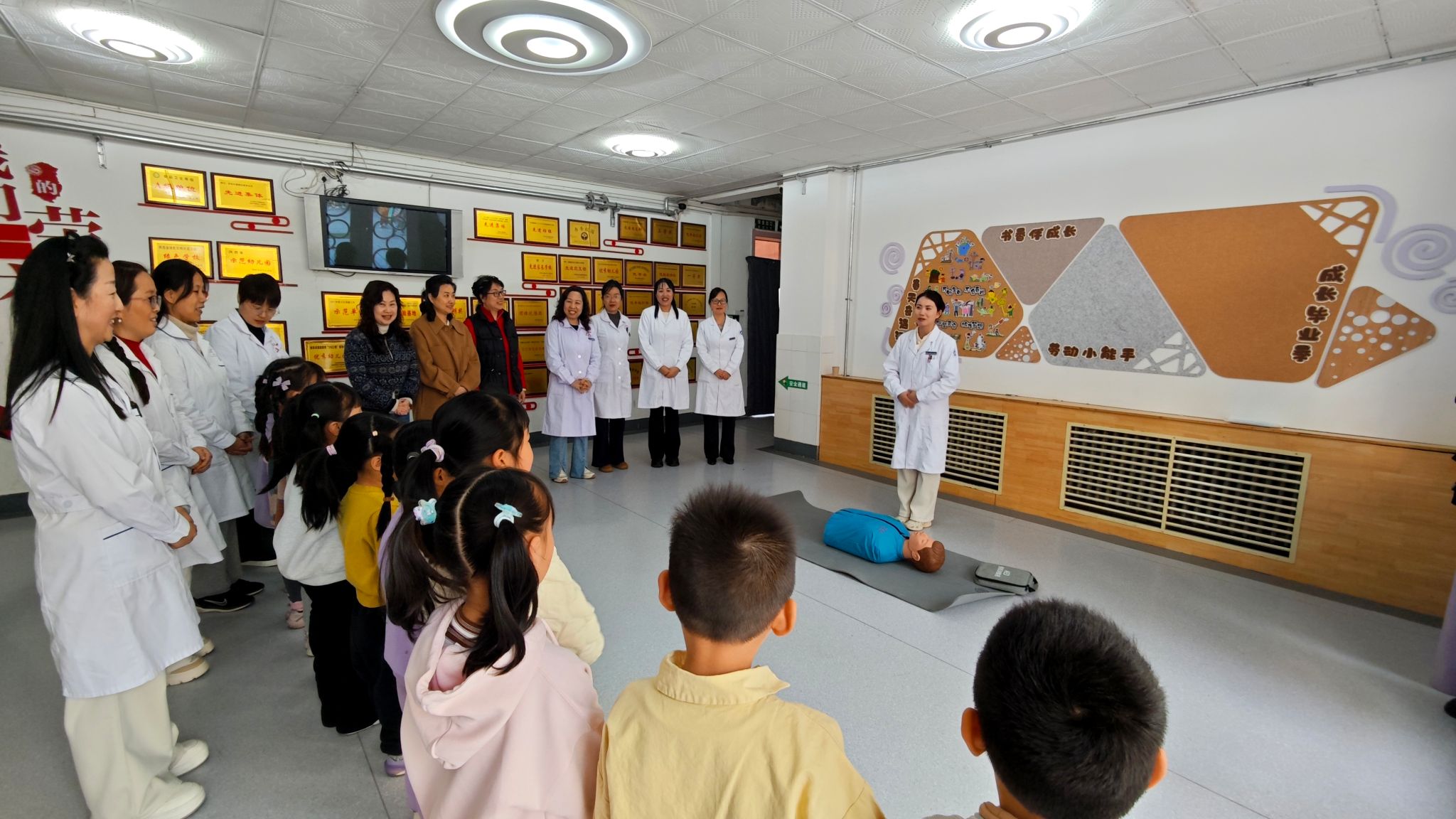 仪式结束后,校医院急救团队为幼儿园大班幼儿开展趣味应急救护培训。医护人员摒弃传统说教模式,以“抢救小熊”为主题,将专业急救知识转化为通俗易懂的趣味内容;通过仿真道具开展情景模拟与实操教学,手把手指导幼儿学习心肺复苏基础技能,认识AED急救设备,让孩子们在互动中掌握实用自救互救知识,树立自我保护意识。幼儿园教师表示,此次活动生动实用,让安全知识真正入脑入心,也培养了幼儿关爱他人的意识。