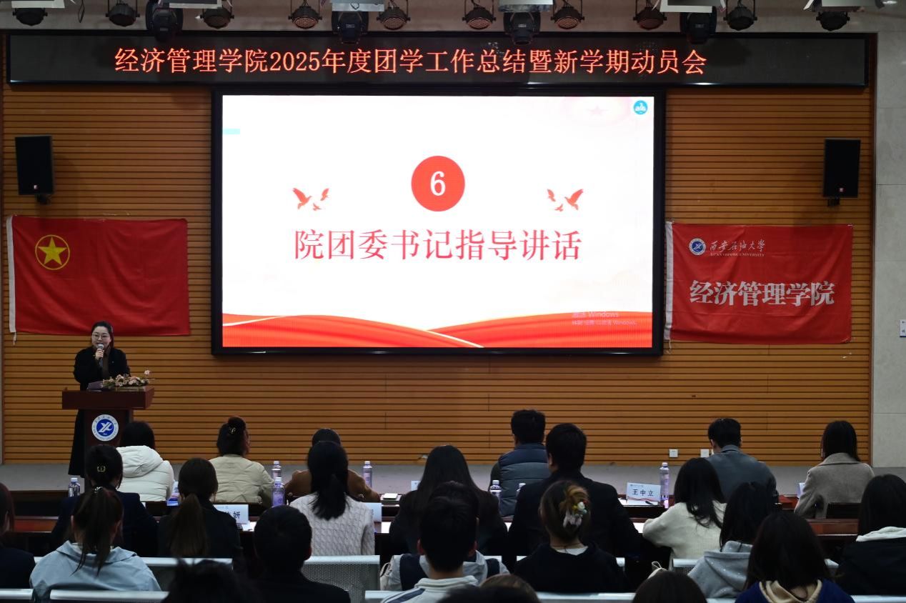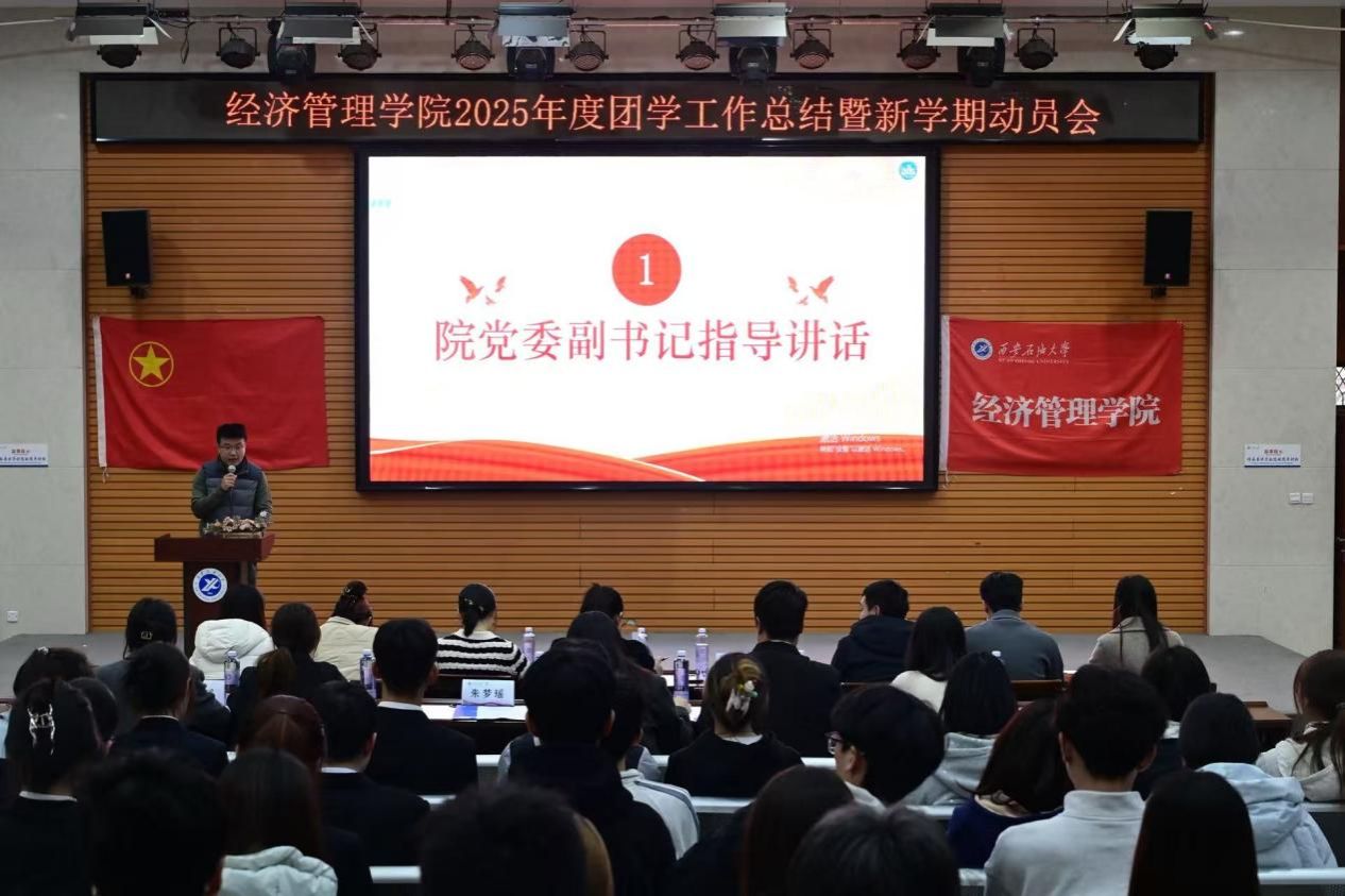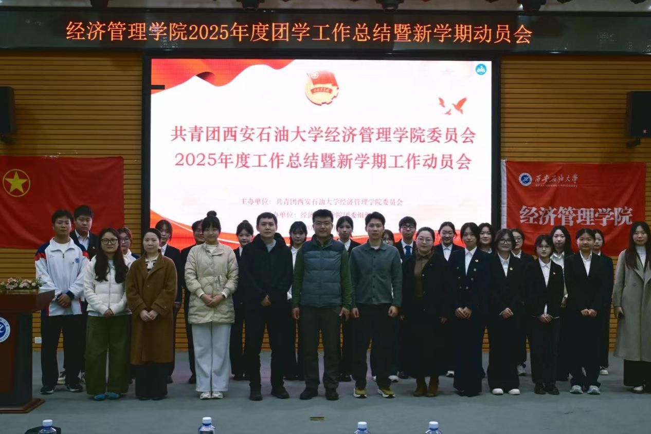 为全面总结学院2025年度团学工作成果,凝聚奋进力量,部署新学期工作任务,西安石油大学经济管理学院于3月25日下午在鄠邑校区就业指导中心多功能厅召开2025年度团学工作总结暨新学期工作动员大会。经济管理学院党委副书记赵纪飞、院团委书记张硕、学院专兼职辅导员及全体团学干部参会。