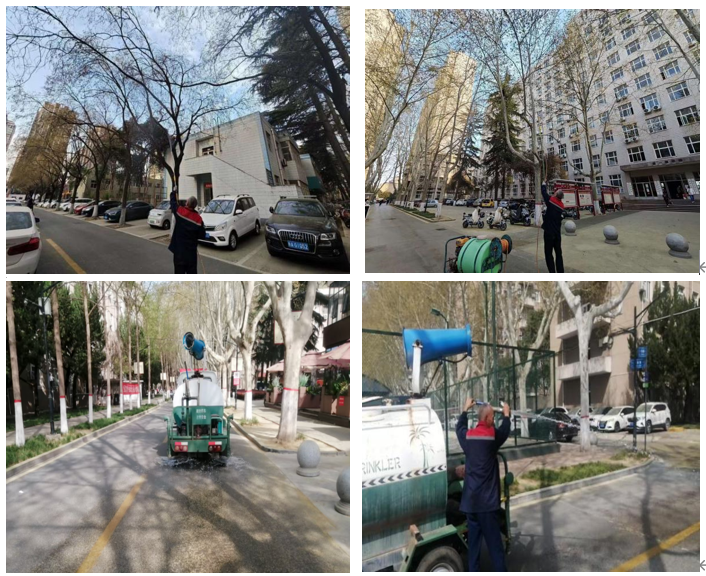 为减少对师生出行的影响,防治工作于3月下旬至4月中旬分批次进行,作业时间均安排在非通行高峰时段,覆盖主干道、绿化带、教学区、生活区等重点区域。工作人员使用高压喷淋设备,对杨柳树及花粉源植被进行细致冲刷,从源头抑制飞絮、减少花粉扩散,同时为绿植补水,让空气更清新。
