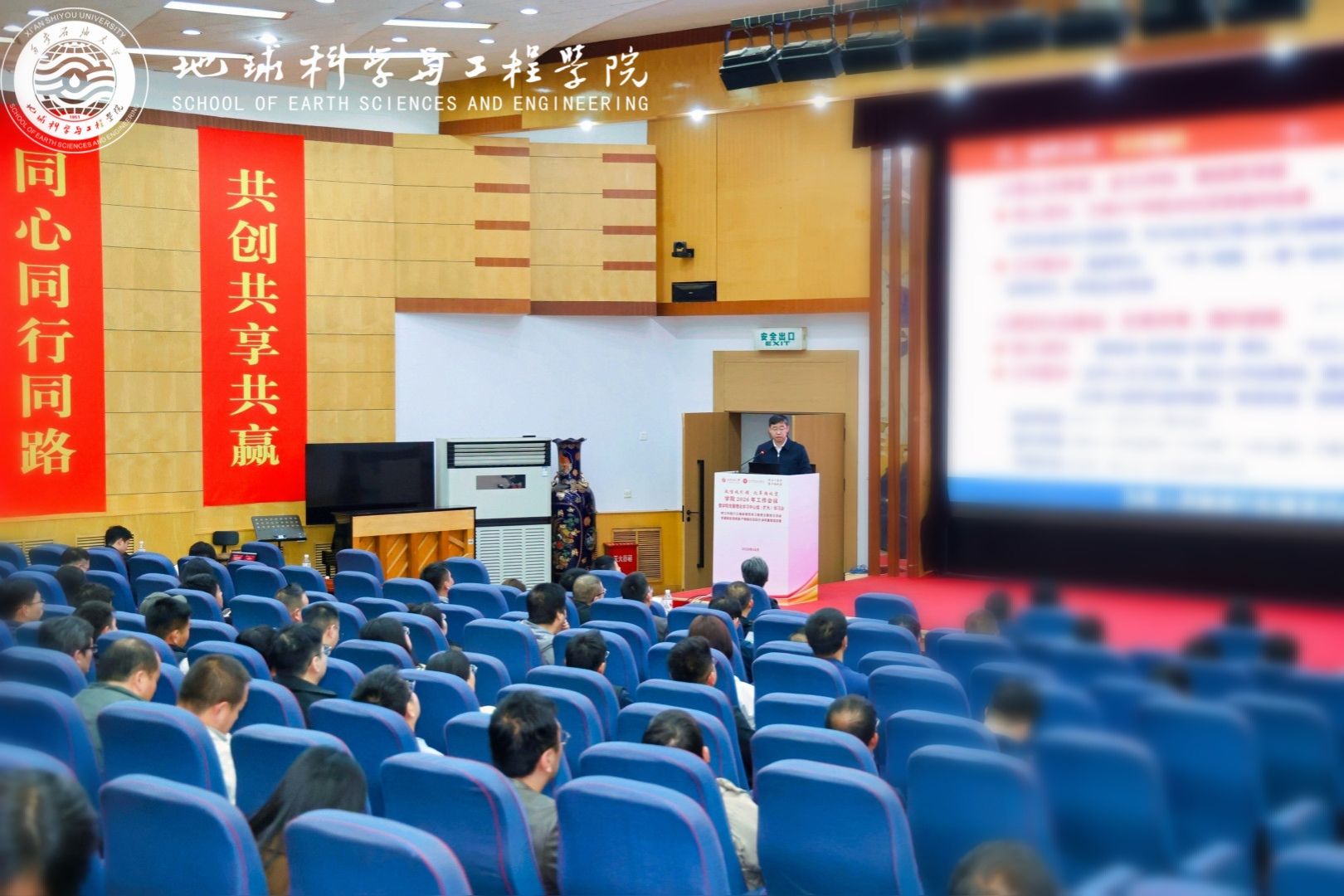 为贯彻落实学校“体系重塑年、质量跃升年、改革攻坚年”建设部署,深入推进树立和践行正确政绩观学习教育,4月2日,地球科学与工程学院“同上一堂课 聚力谱新篇”2026年工作会议暨党委理论学习中心组(扩大)学习会在雁塔校区举行。会议以“政绩观引领、改革路攻坚”为主线,围绕“党建赋能强根基、产教融合促跃升、体系重塑谋发展”主题,通过专题思政课、专题党课、学院工作报告、中心组学习研讨及警示教育等环节,凝聚发展共识,明确攻坚方向。校长王进富到会指导并为与会人员讲授专题思政课和党课。学院党委书记高黎主持会议,学院领导班子成员、全体教职工及研究生代表参加会议。