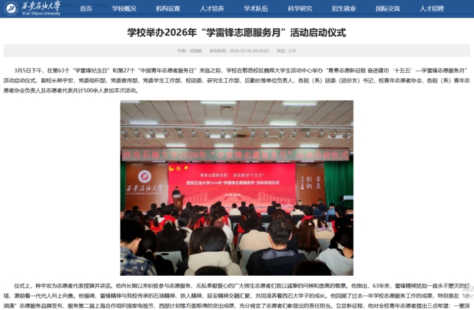在第63个“学雷锋纪念日”和第27个“中国青年志愿者服务日”来临之际,学校在鄠邑校区腾辉大学生活动中心举办“青春志愿新征程 奋进建功‘十五五’—学雷锋志愿服务月”活动启动仪式,副校长种宇宏,党委组织部、党委宣传部、党委学生工作部、校团委、研究生工作部、后勤处等单位负责人,各院(系)团委(团总支)书记,校青年志愿者协会、各院(系)青年志愿者协会负责人及志愿者代表共计500余人参加本次活动,有效凝聚了“学雷锋、做先锋、建新功”的青春思想共识。