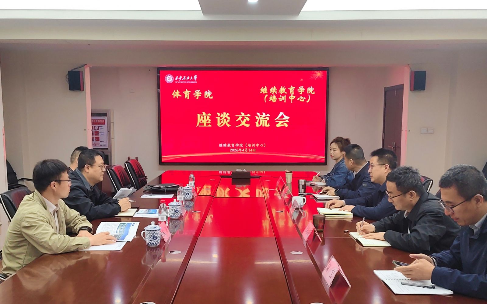 4月14日上午,继续教育学院(培训中心)与体育学院在明德校区北楼第一会议室举行座谈交流会。两学院领导班子成员、相关办公室负责人参加会议,继续教育学院(培训中心)院长(主任)林红先主持会议。