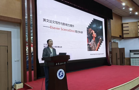许靖博士以《英文论文写作与影响力提升——ScienceDirect助力科研》为题,详细介绍了爱思唯尔的资源以及爱思唯尔期刊的投稿方法,重点讲解了英文论文的写作技巧和投稿经验、图表制作、AI使用和推荐成为期刊审稿人等内容,为参加讲座的师生带来了系统的写作投稿知识和经验。