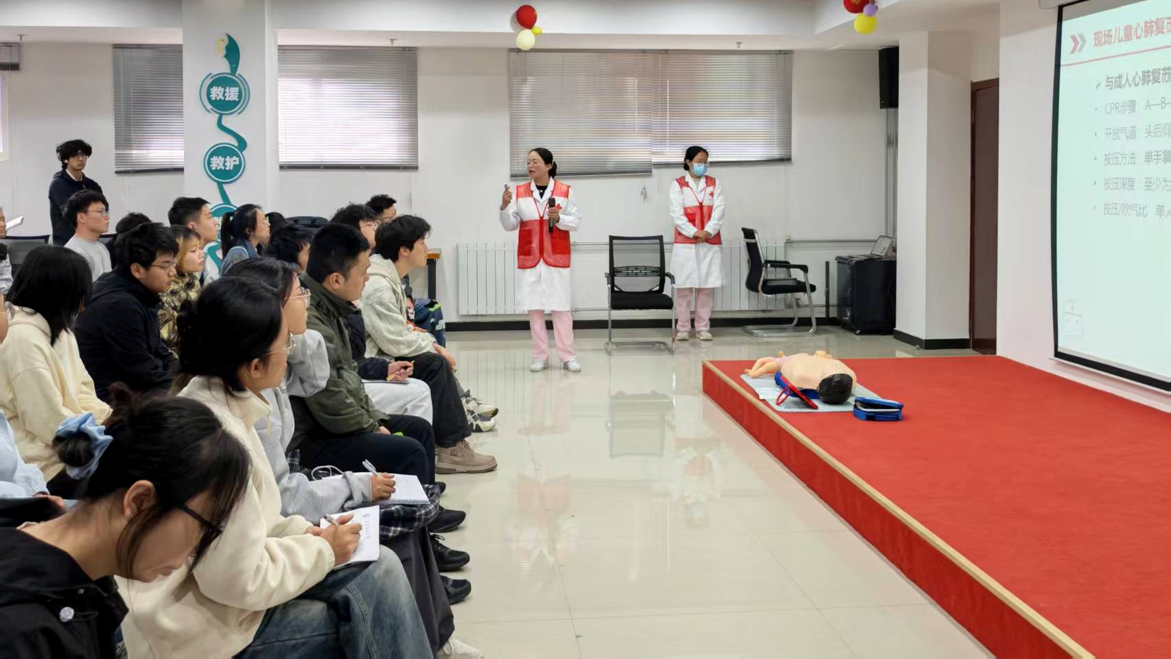 作为全国第三批急救教育试点学校,为进一步普及应急救护知识,强化校园安全应急保障能力,提升师生突发状况自救互救与应急处置能力,筑牢师生生命健康安全防线,4月21日下午,校医院联合校工会、西安市鄠邑区红十字会,圆满举办第七期师生应急救护培训,共计55名师生参训。