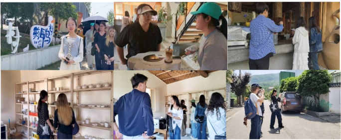 随后,师生一行来到剪鸭村新近开业的“拾泥造物”陶艺DIY体验店。在与店主交流中,学生们了解到,陶艺制作周期较长,通常需要两到三次才能完成一件作品,单次体验约2小时,且目前客流量偏低,生意尚不景气。会计(ACA)组学生,现场展开小型调研,并计划写入后续的英文版《乡村经济可持续性评估报告》中。学生从成本结构、客户留存、体验门槛等角度分析后,给店主提出建议:可开发以“剪鸭村”为品牌IP的陶艺冰箱贴作为补充产品,降低消费者的时间与技能门槛,同时挖掘陶艺背后的乡村手作故事,通过中英文品牌叙事吸引更多年轻游客。