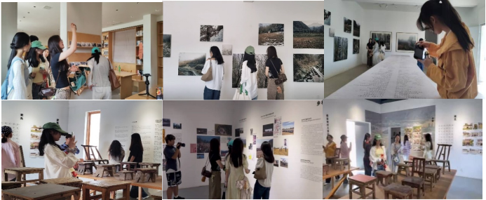 告别剪鸭村,研学队伍抵达蔡家坡村,走进了村图书馆和村史馆。这座村史馆的设计聚焦农业、农村、农民,从日常生活出发,力求成为村落历史发展的活态见证。设计上以村民为主体,以村民日常生活为展示内容,展陈处处体现朴拙之美。在参观的过程中,同学们意识到,村史馆是连接过去与现在的桥梁。新闻组学生用镜头记录下展板上“2018年人均收入13252元”与“2023年增至22918元”的对比数据,以及历届“关中忙罢节”的盛况,感叹艺术乡建带来的真实改变。
