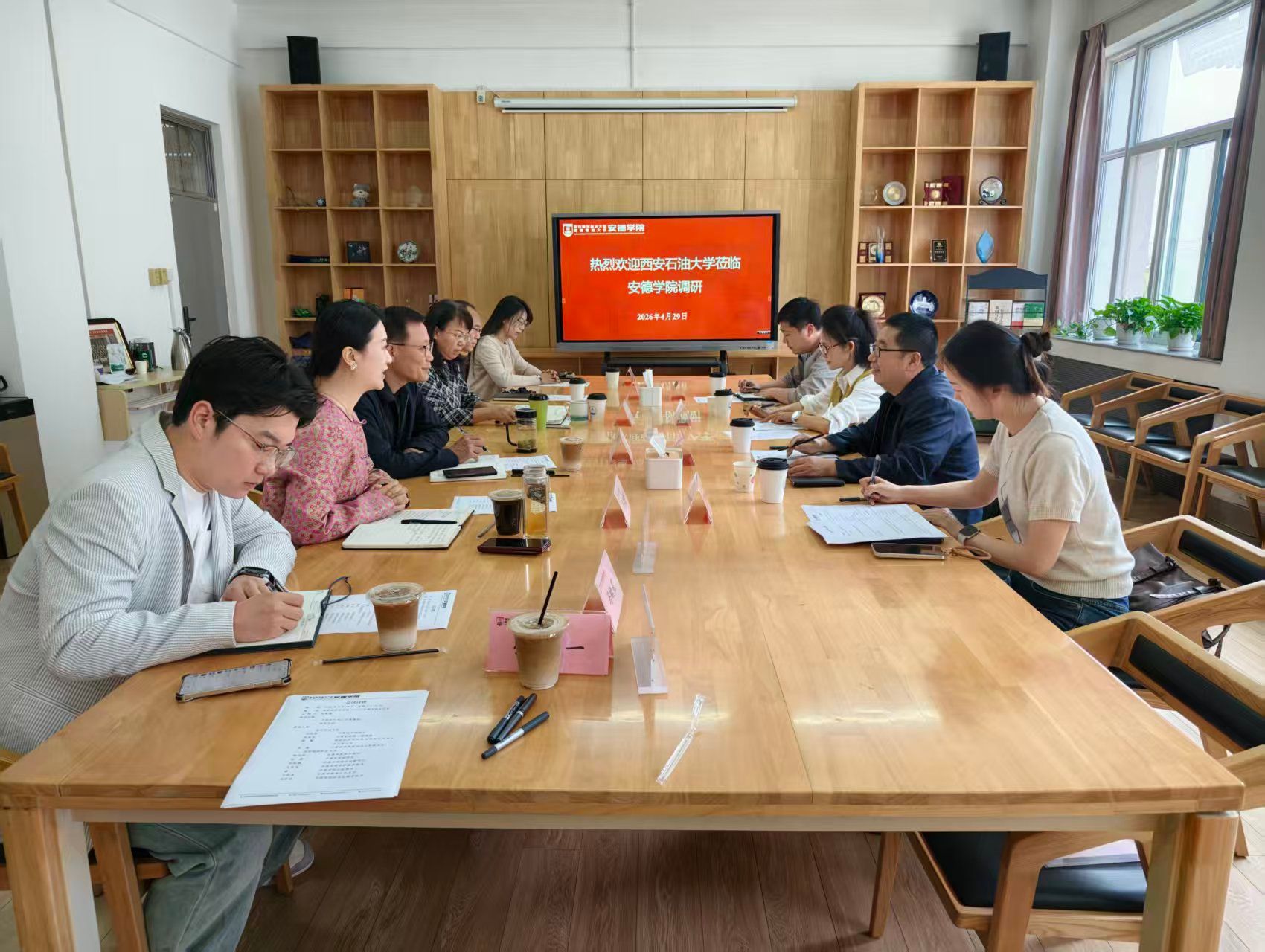 调研期间,调研组先后走访了陕西科技大学阿尔斯特学院、西安航空学院计算机与人工智能学院、西安建筑科技大学安德学院。三所单位均给予热情接待,并详细介绍了各自的办学经验。陕西科技大学阿尔斯特学院原党委书记贺涛、常务副院长王伟伟;西安航空学院计算机与人工智能学院党委书记李中、副院长(主持工作)刘舟洲、国际工学院副院长裴鑫;西安建筑科技大学安德学院执行院长熊仲明、副院长赵蕾、党总支副书记张紫薇等分别参与座谈交流。